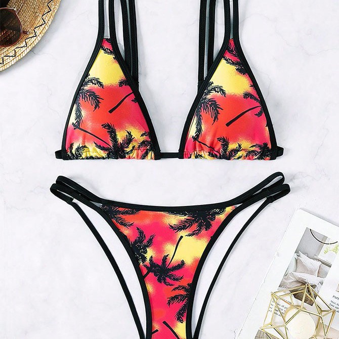 欧美印花比基尼套装三角杯双肩带丁字裤夏季海滩度假跨境泳装定制