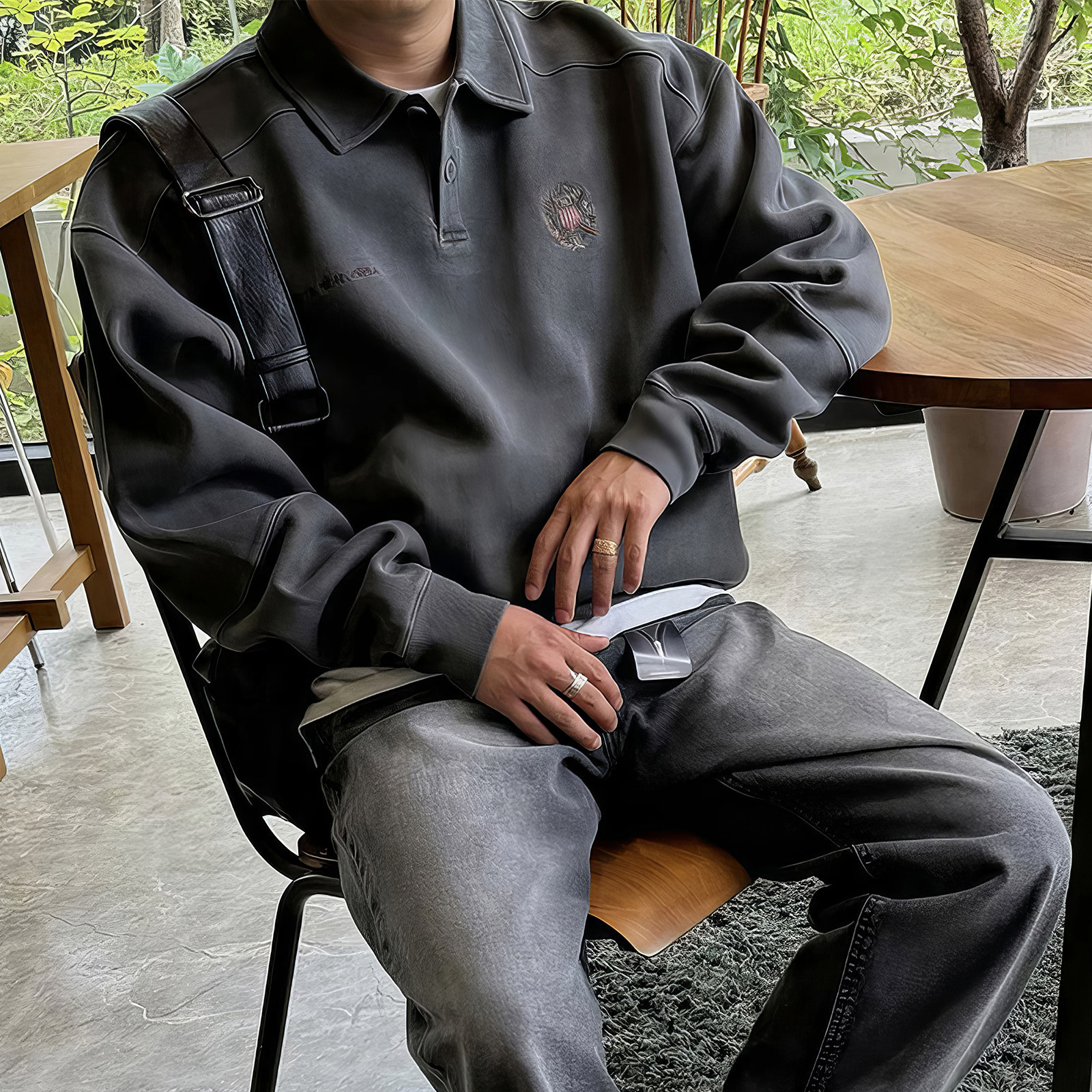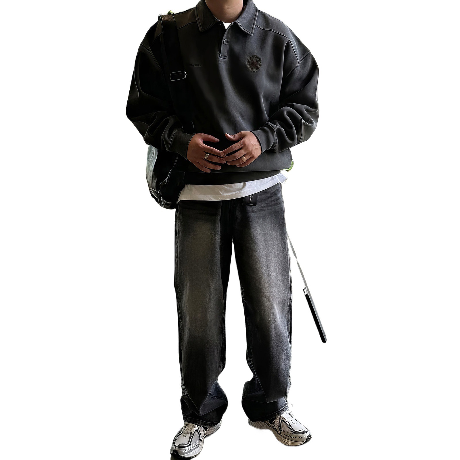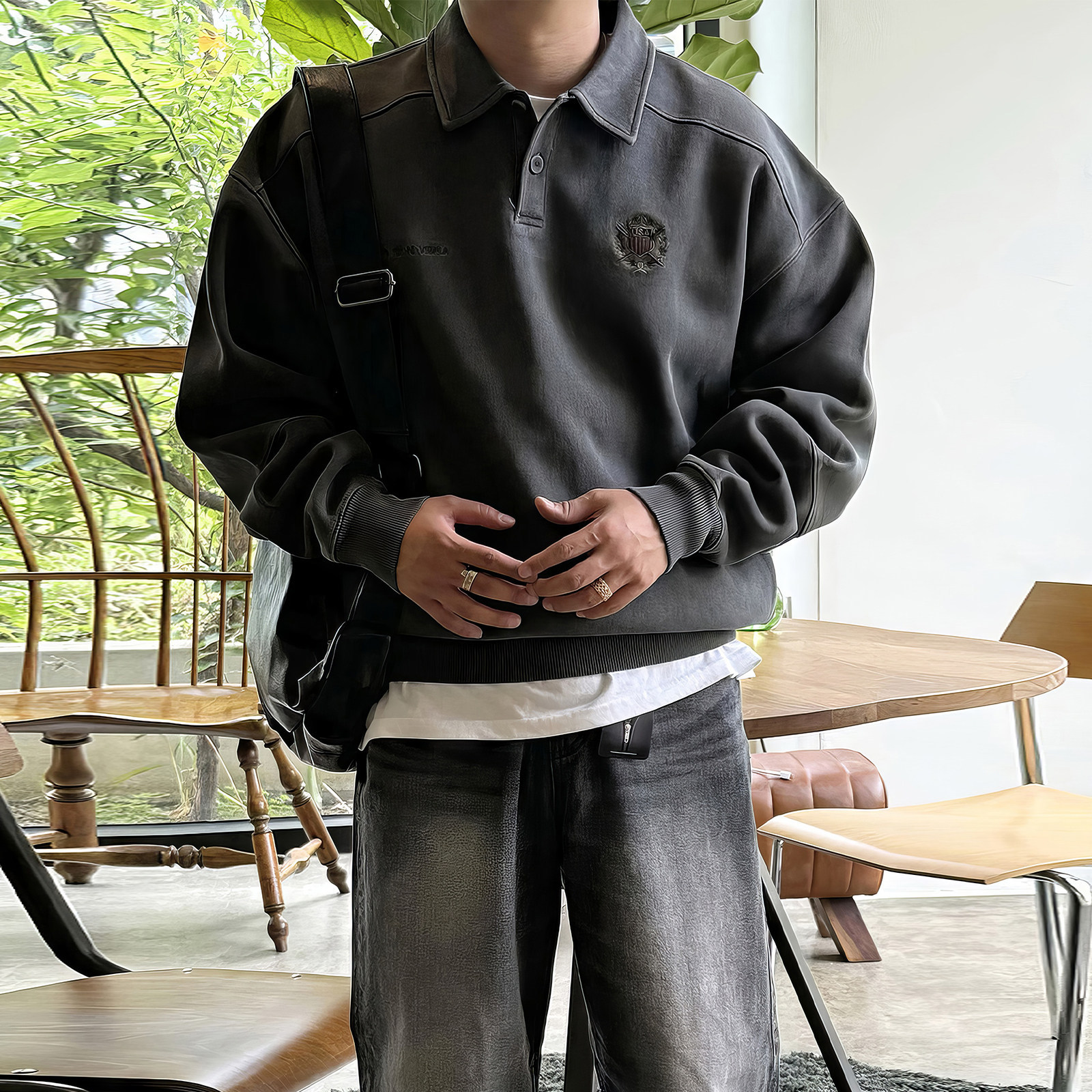 深灰翻领刺绣POLO领卫衣男春秋美式复古做旧水洗重磅上衣休闲外套