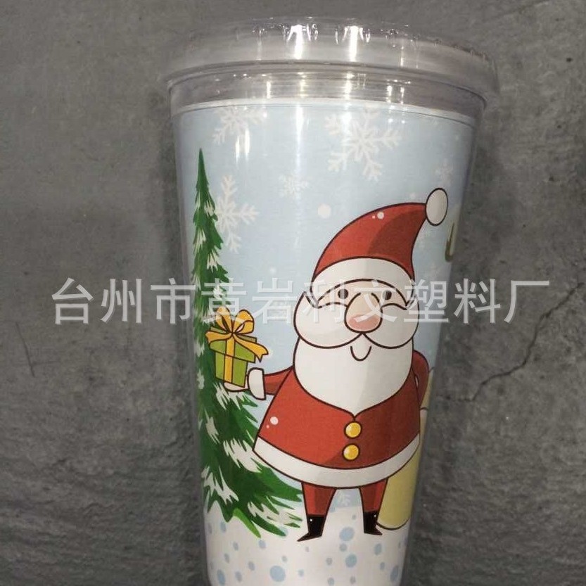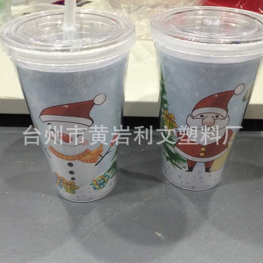 新款创意小雪人圣诞杯子 塑料杯圣诞节礼物PS水杯 带盖双层吸管杯