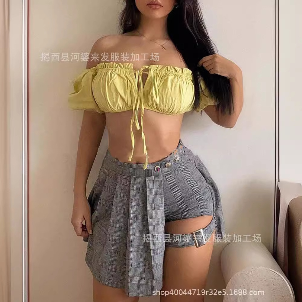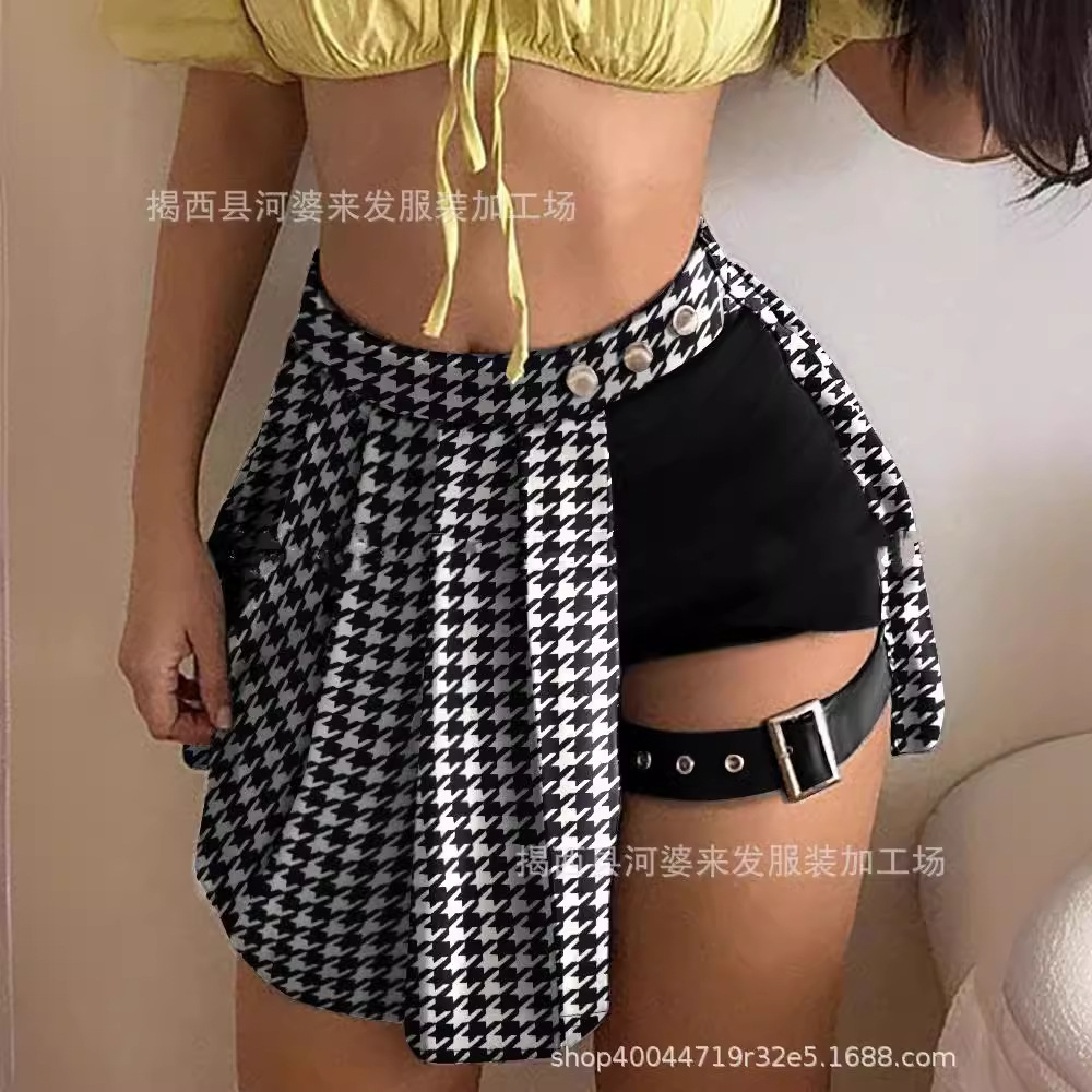 2024独立站跨境女装欧美夏季新款有个性小设计格子纽扣不对称短裙