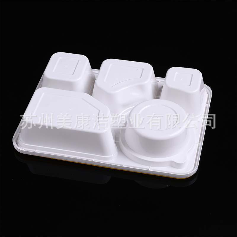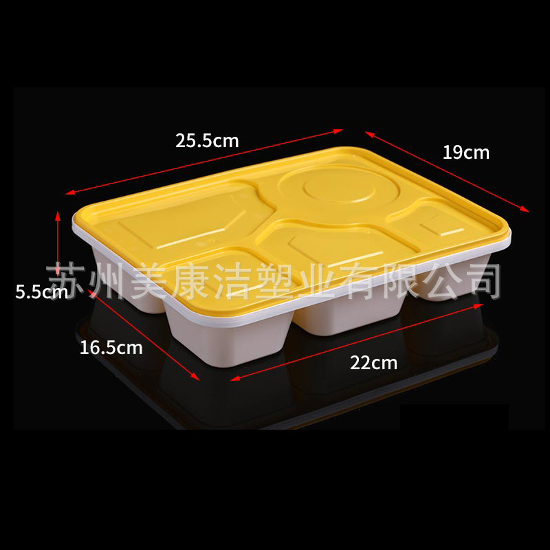 一次性塑料餐盒正方形五格乳白色底黄盖微波冷藏锁扣可配汤碗饭盒