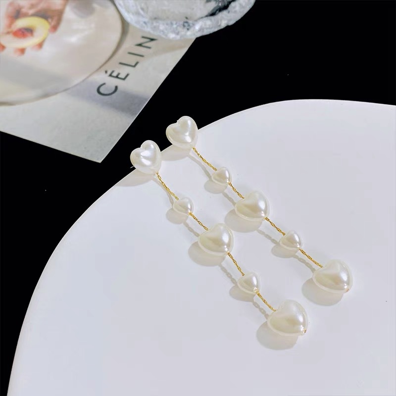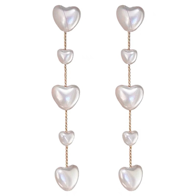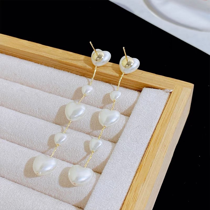 时尚轻奢百搭2024新款气质心形珍珠流苏女士耳环长款淑女耳饰