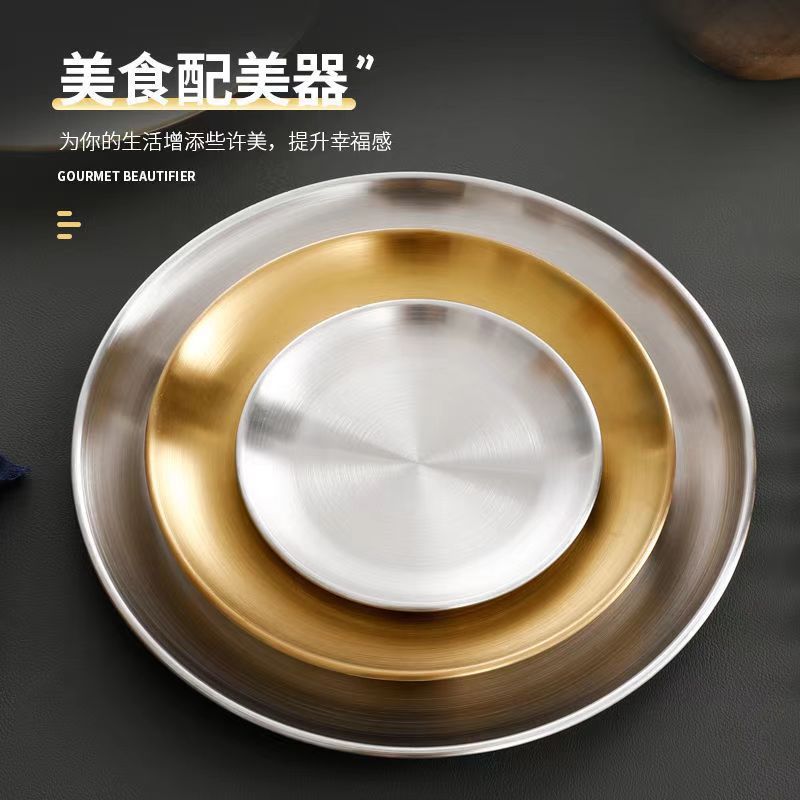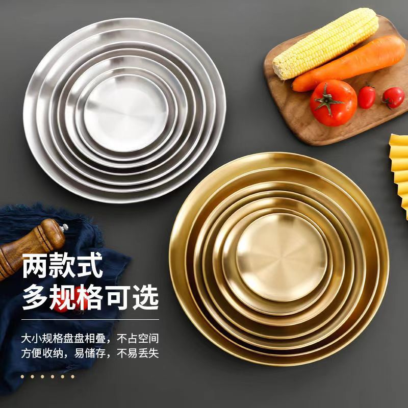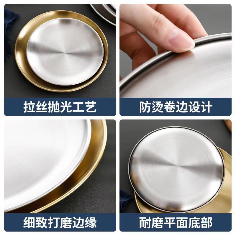 韩式不锈钢加厚圆盘拉丝盘子吐骨碟单层平底菜盘商用烤肉盘水批发