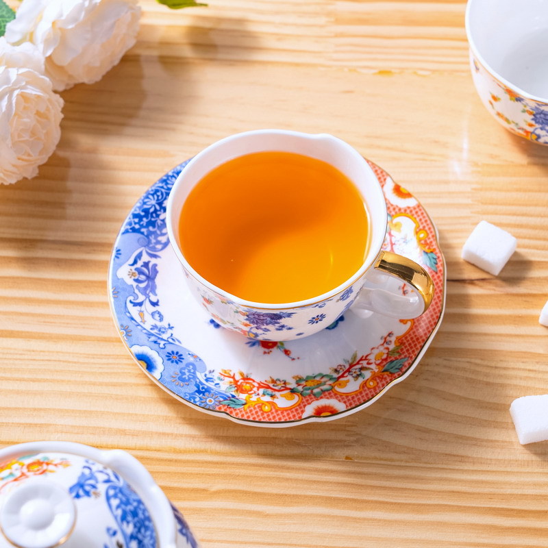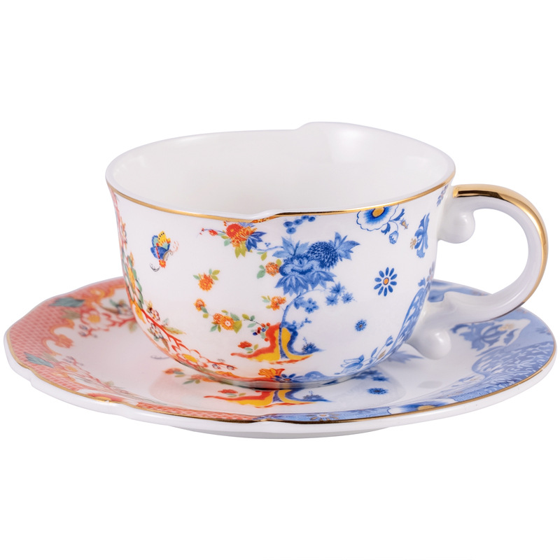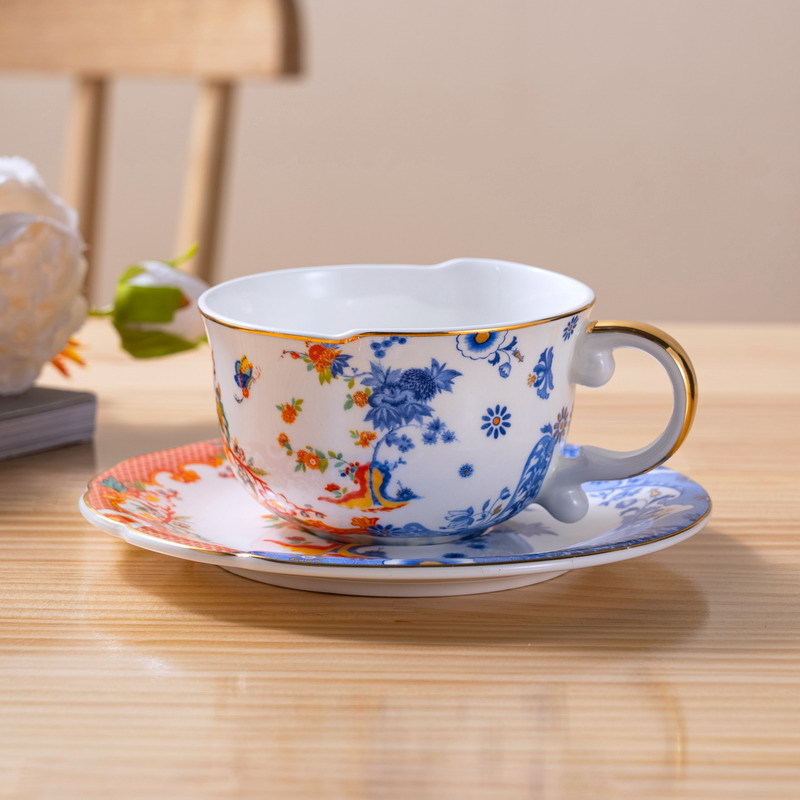 高骨瓷新中式描金把不规则咖啡杯碟莲纹青花古典风格陶瓷杯骨瓷杯