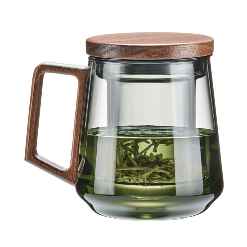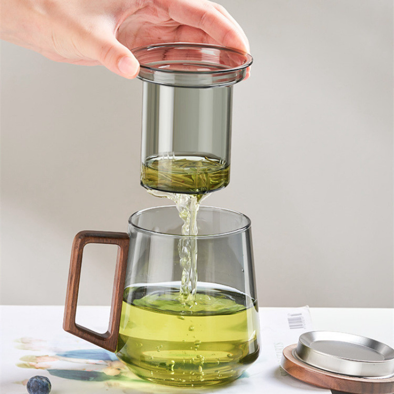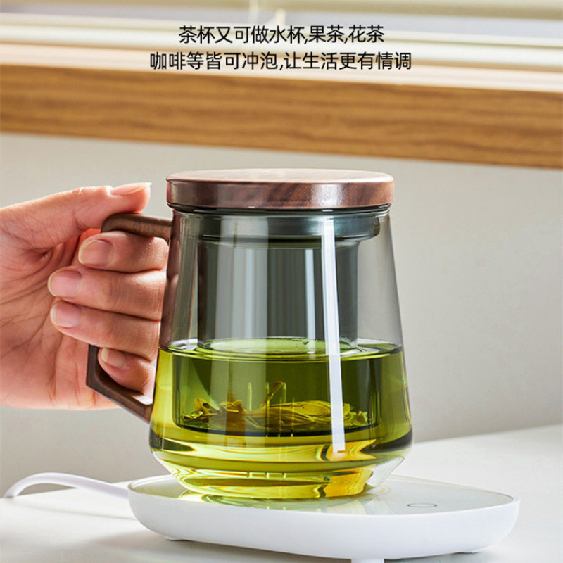 木把隔热玻璃杯带盖茶水杯双层玻璃杯喝水杯高硼硅玻璃三件杯批发