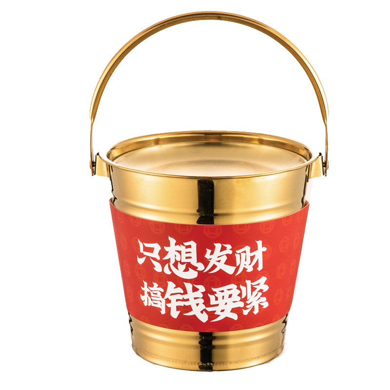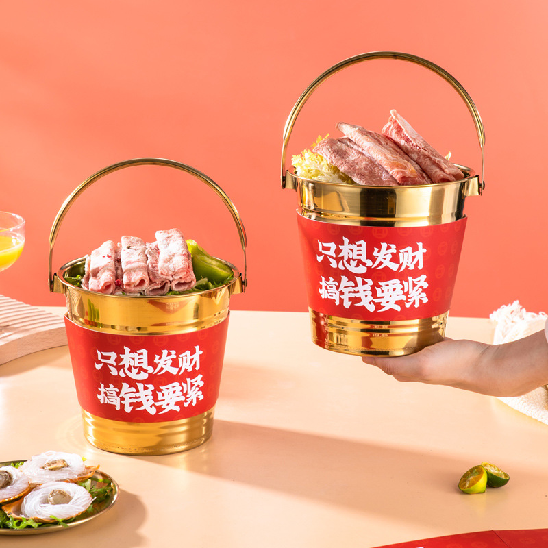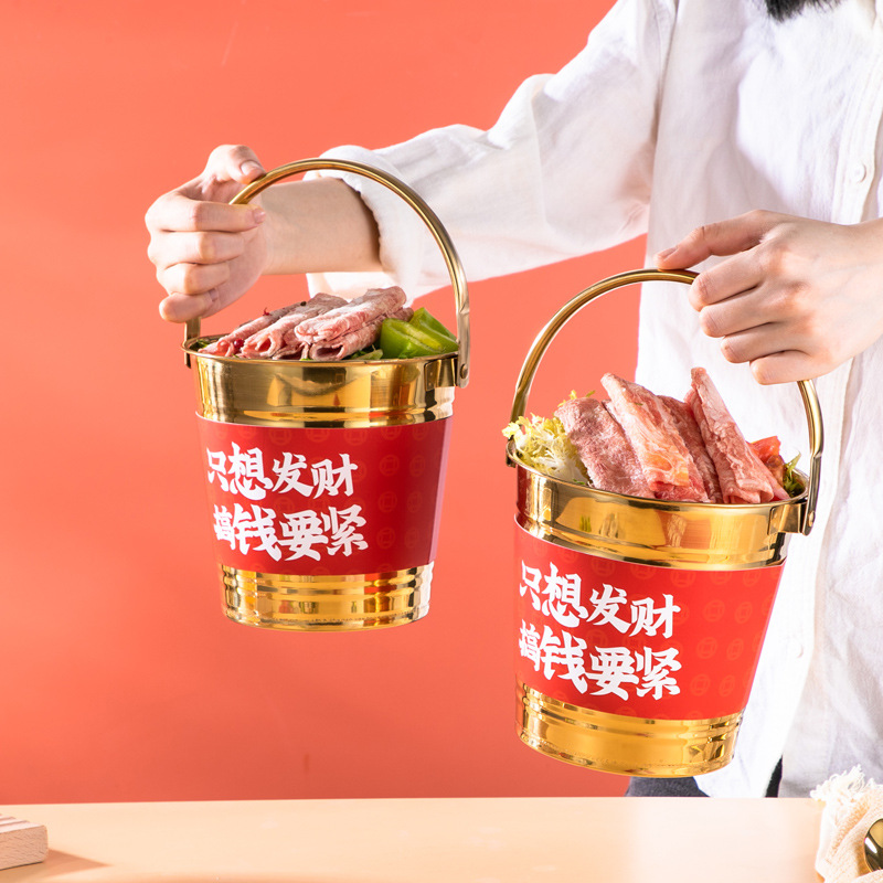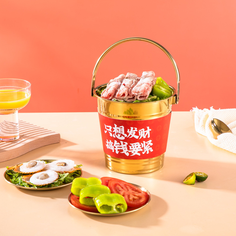 网红肥牛发财桶金色火锅创意餐具韩式烤肉摆盘装饰小吃桶盘子商用