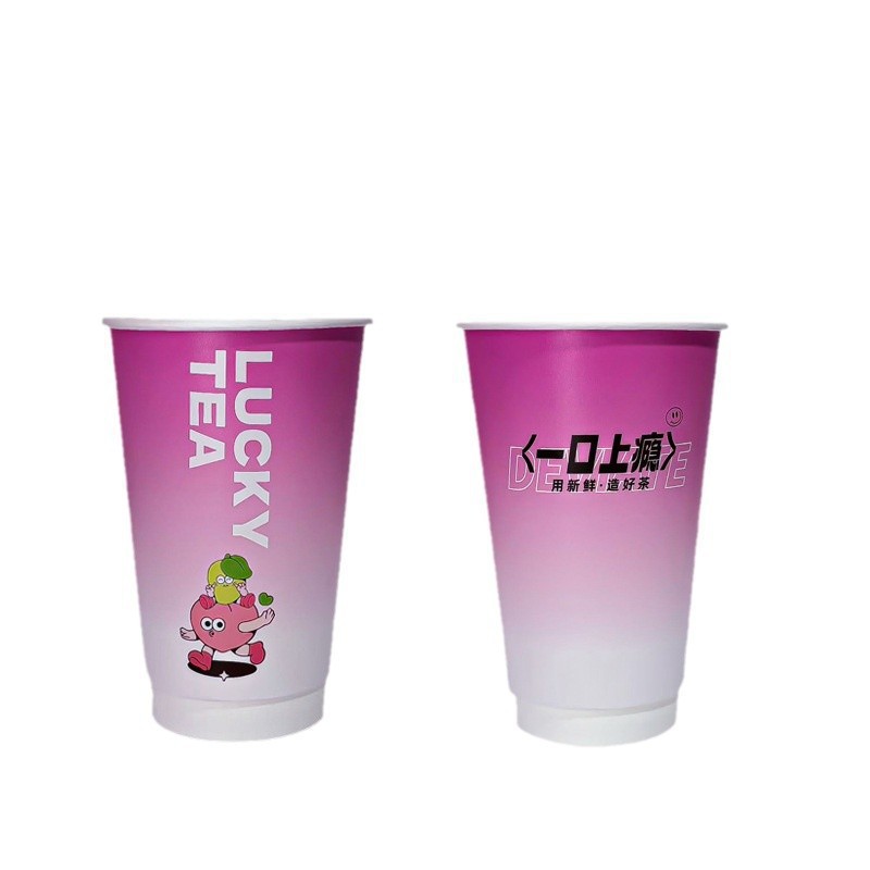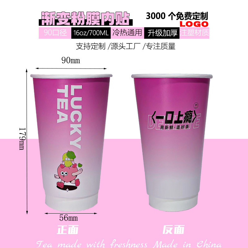 粉色奶茶杯渐变色纸杯咖啡杯膜内贴加厚一次性双层中空吸管中空杯