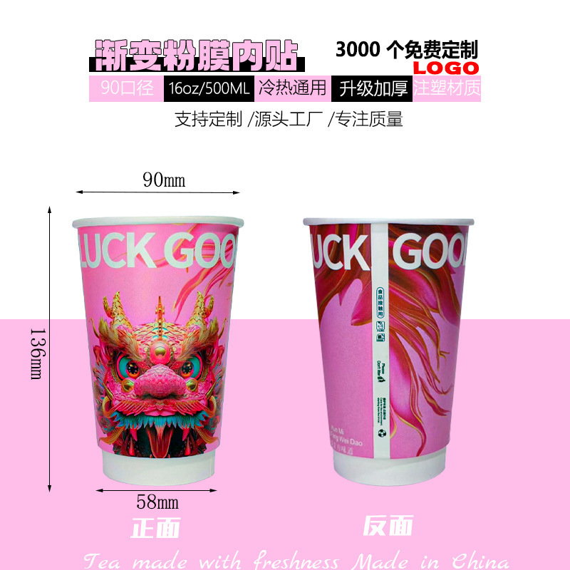 颜色渐变粉色-500ml-中国龙-双层纸杯