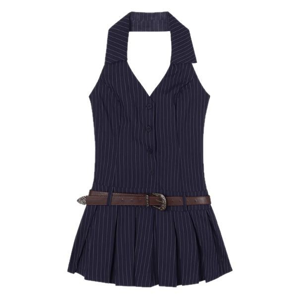辣妹无袖v领挂脖条纹连衣裙女夏季百褶裙露背短裙纯欲辣妹a字裙子