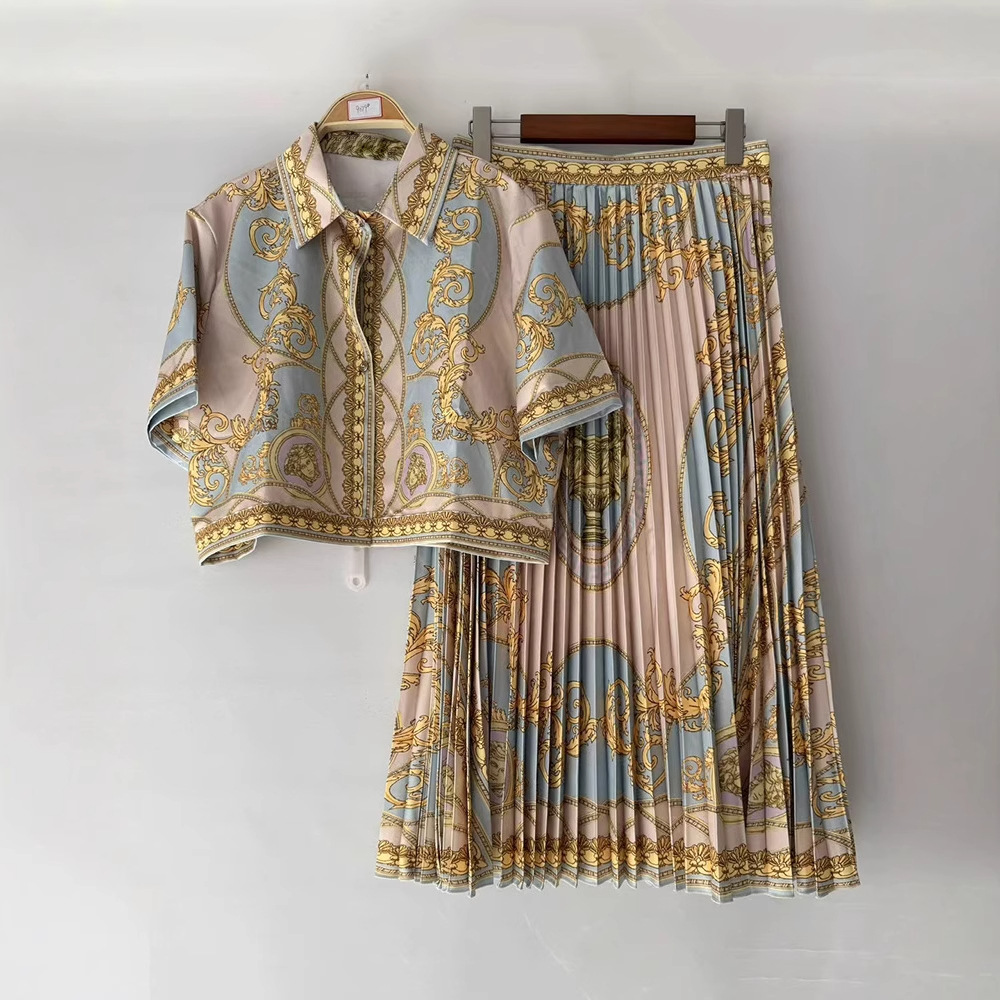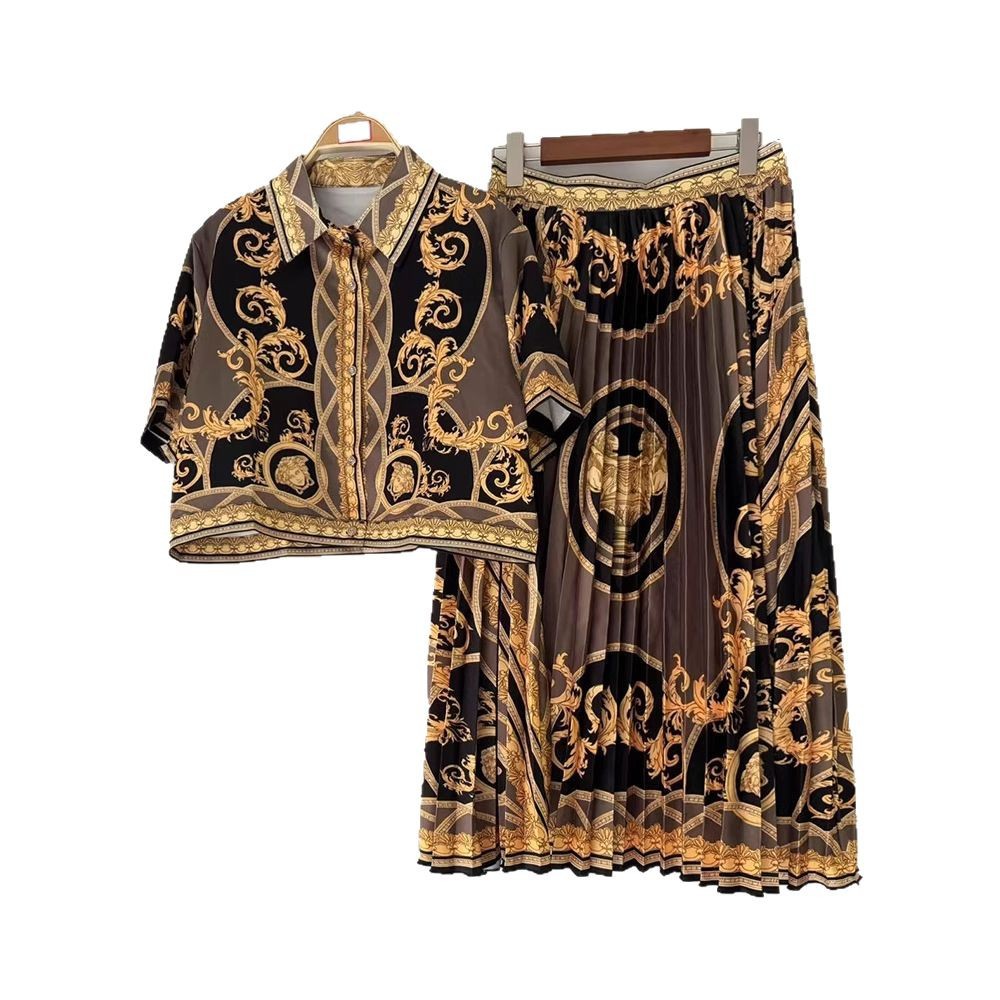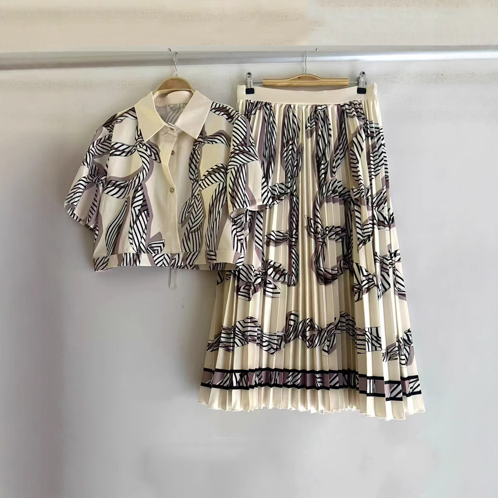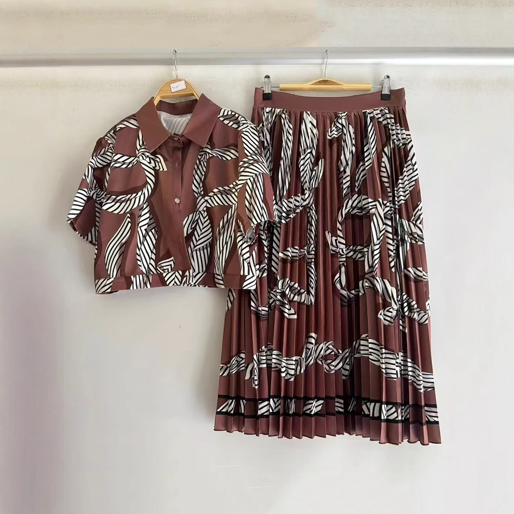 2025外贸女装几何印花衬衫两件套夏+百褶半身裙套装欧美风时尚