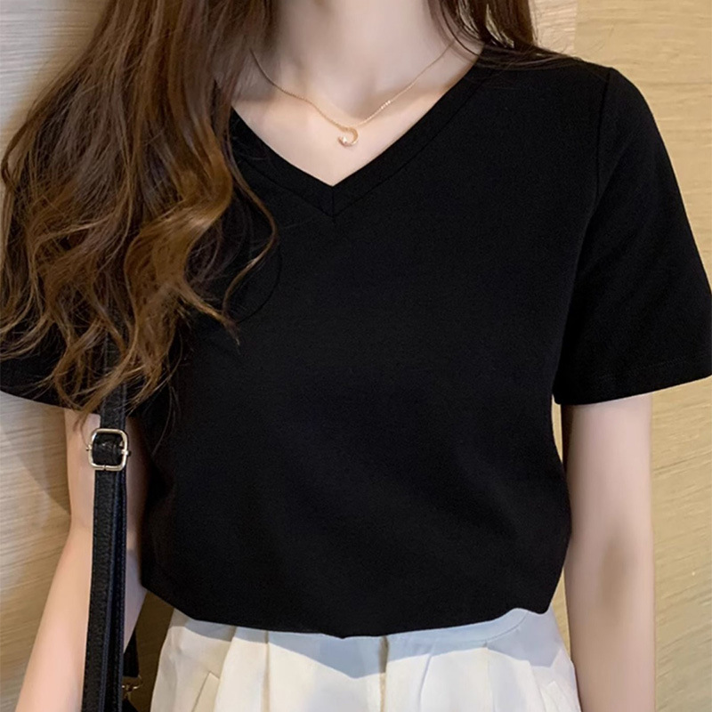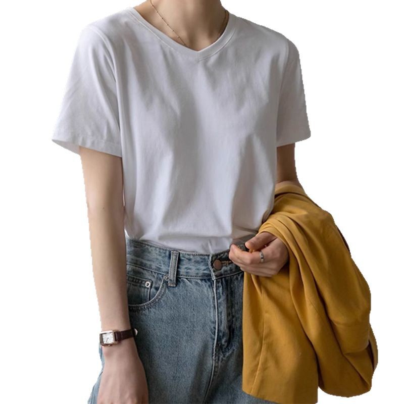 纯棉V领短袖T恤女内搭正肩打底半袖上衣百搭夏季新款