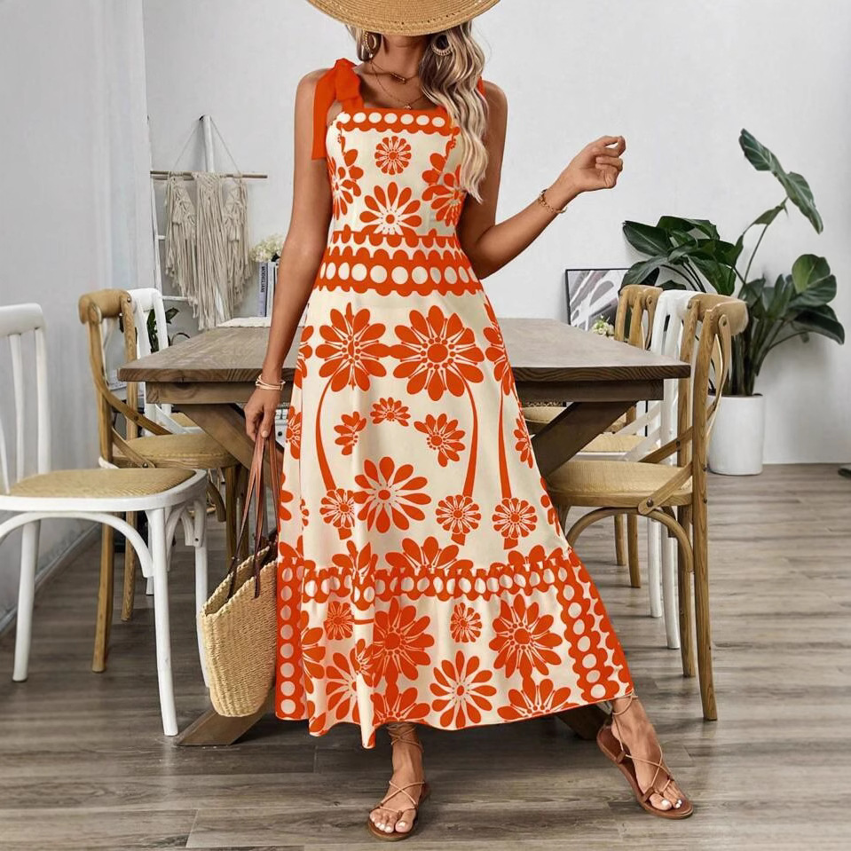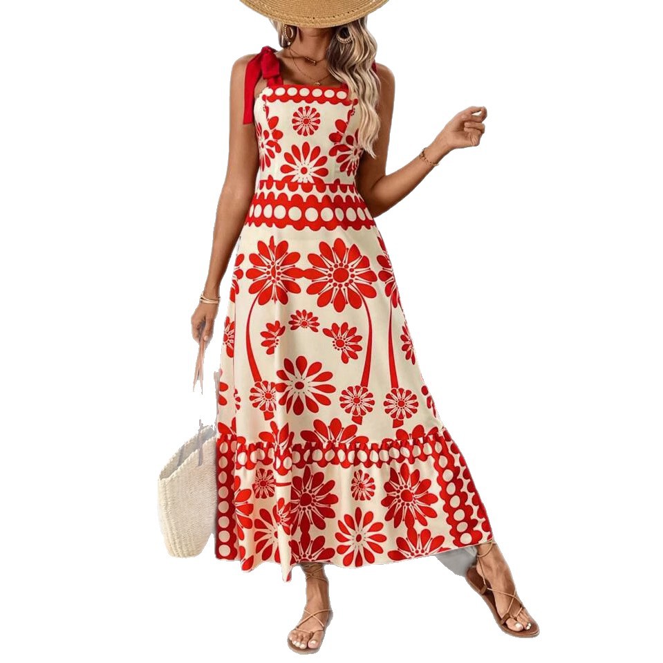 欧美跨境2025新款女装时尚印花系带肩带束腰节日度假风长款连衣裙