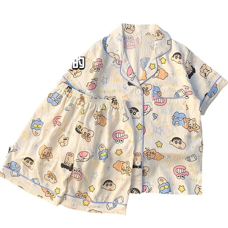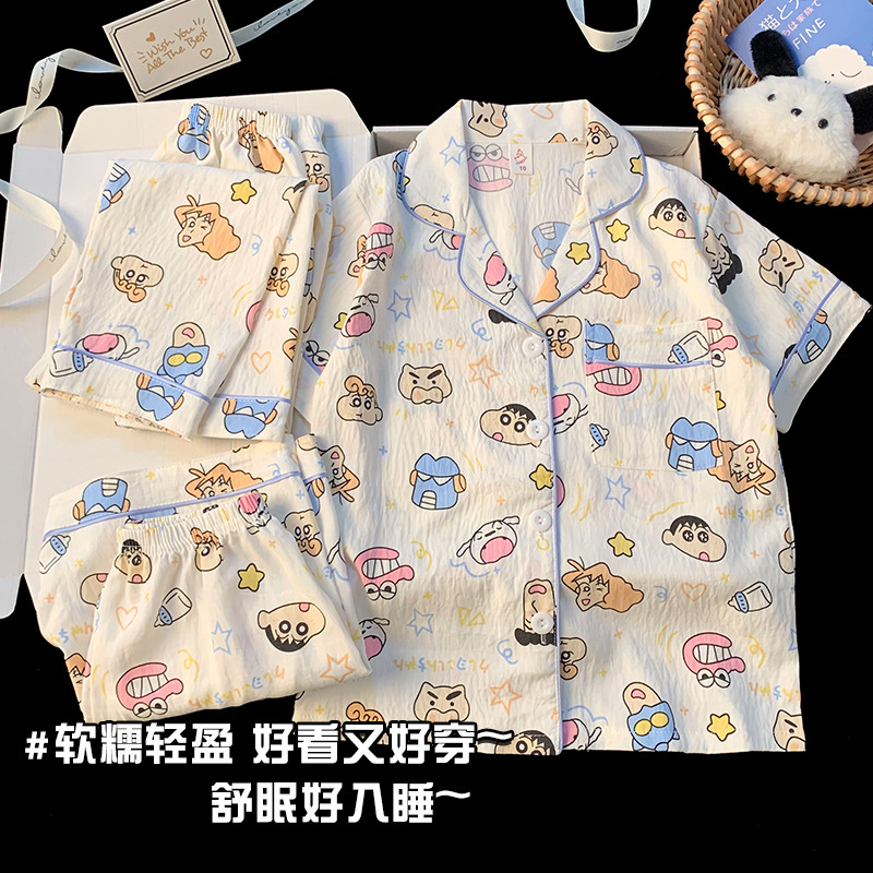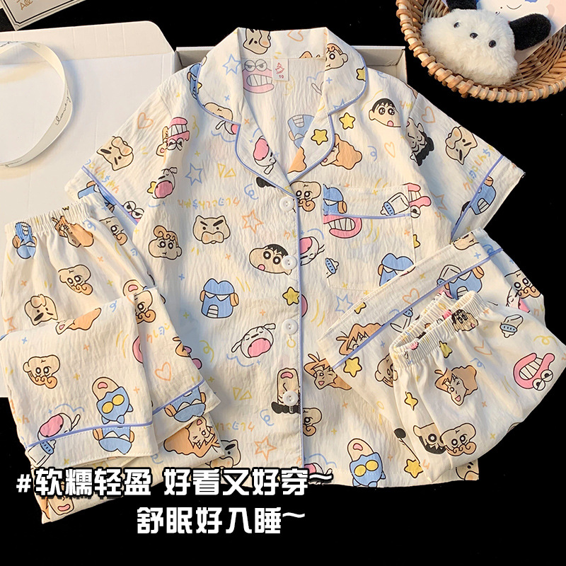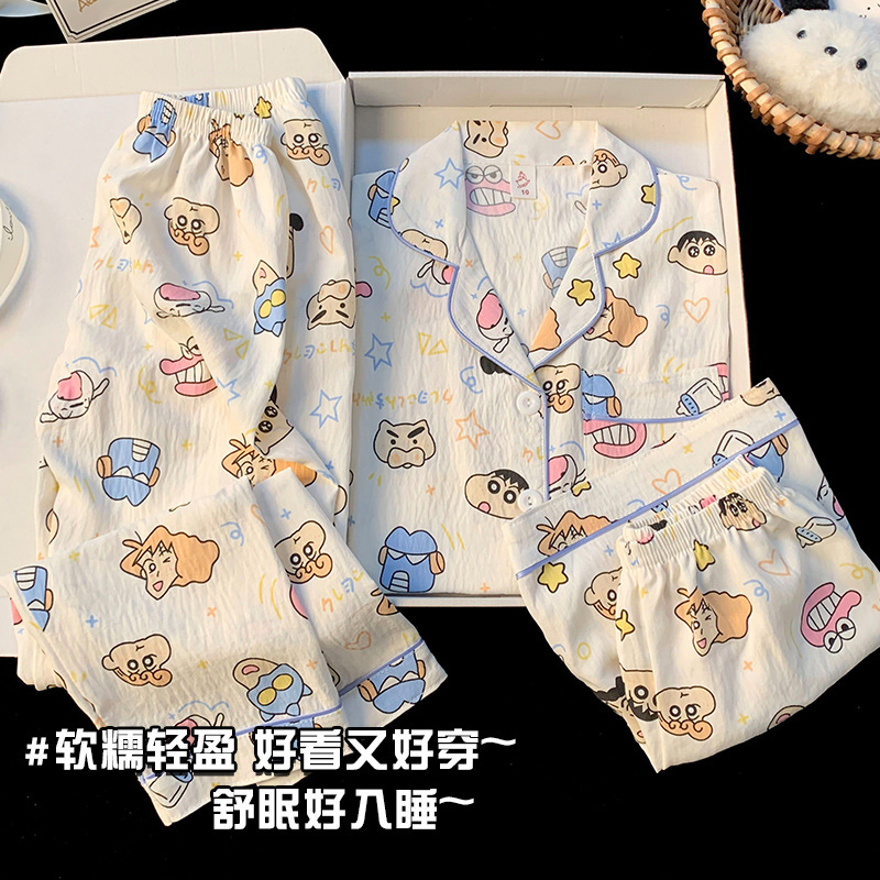 睡衣套装女夏季短袖长裤三件套云朵棉春秋棉纱快开衫翻领家居服