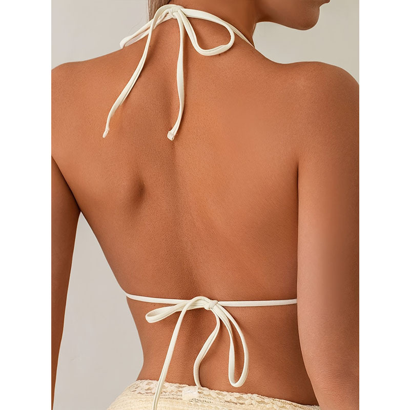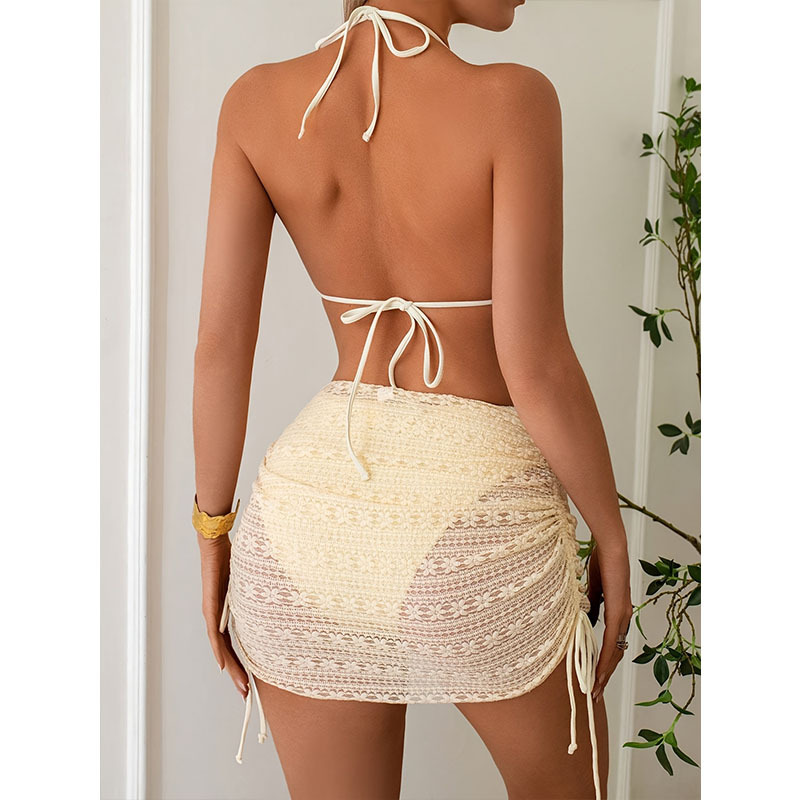 新款欧美时尚性感挂脖系带漏背蕾丝网裙沙滩度假比基尼三件套泳衣