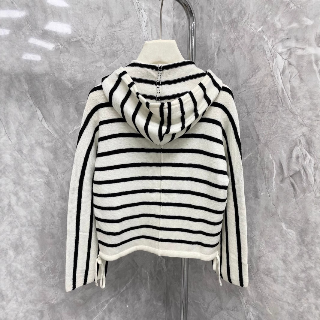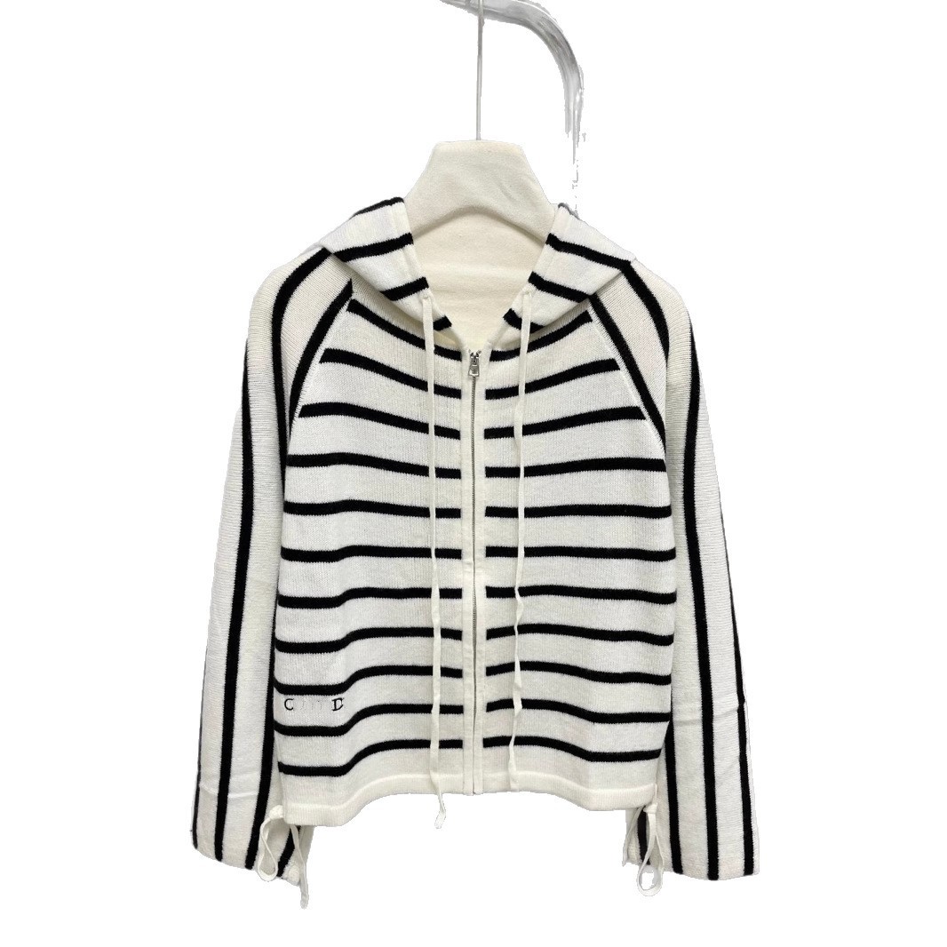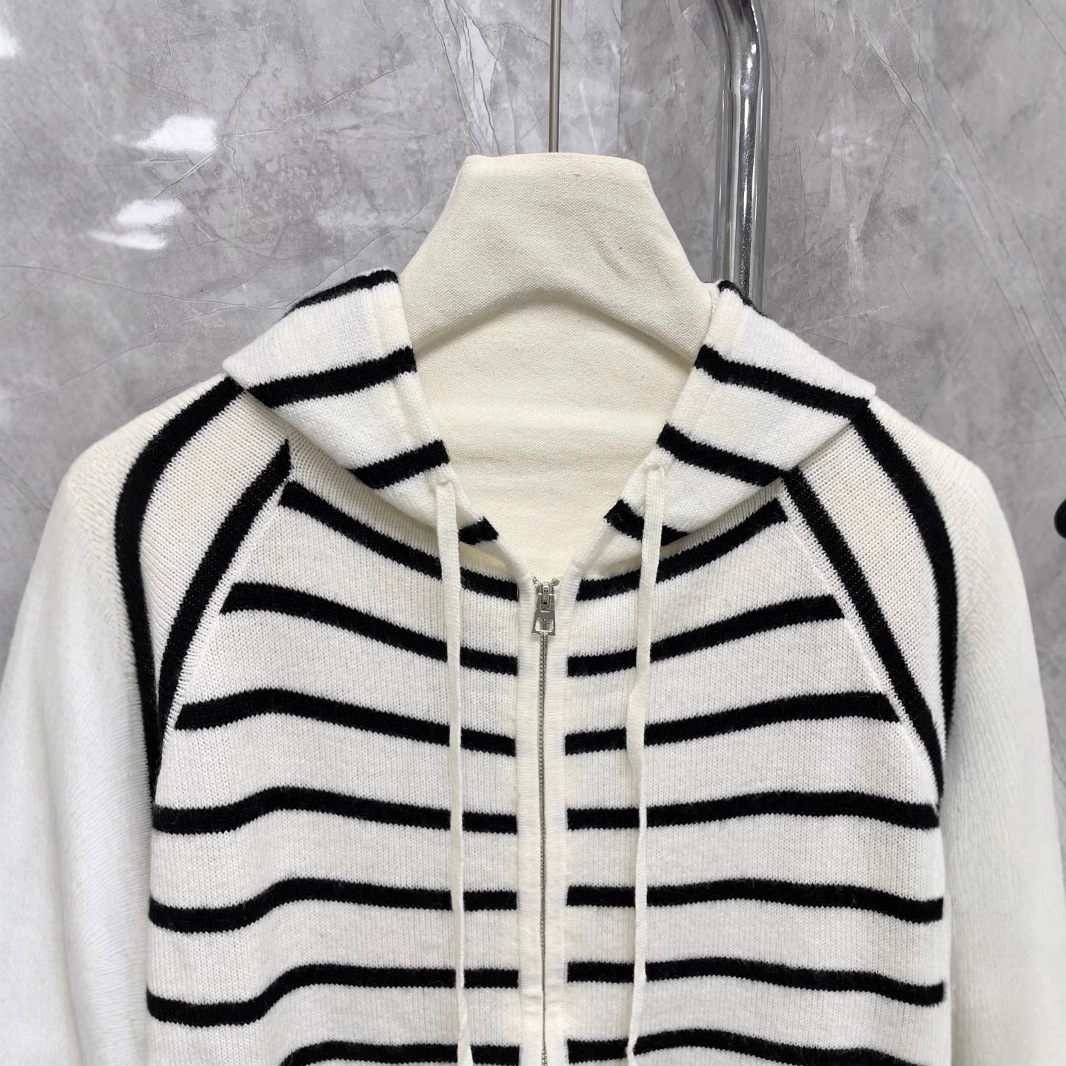 高定25年早秋新款条纹连帽拉链针织开衫时髦慵懒风软糯长袖外套女