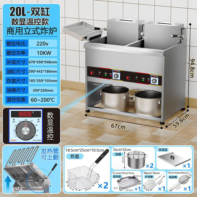 | 规格 | 70升单缸数显炸炉【380v15kw】 | 规格 | 20升双缸数显炸炉【220v10kw】 |