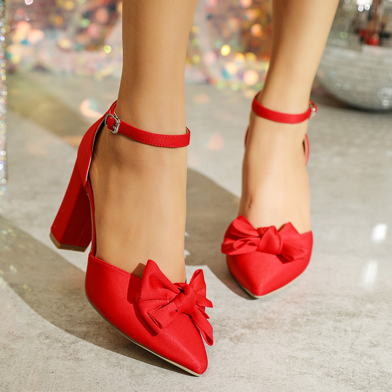 夏季新款气质风尖头中空蝴蝶结红色高跟鞋女一字扣带包头粗跟单鞋