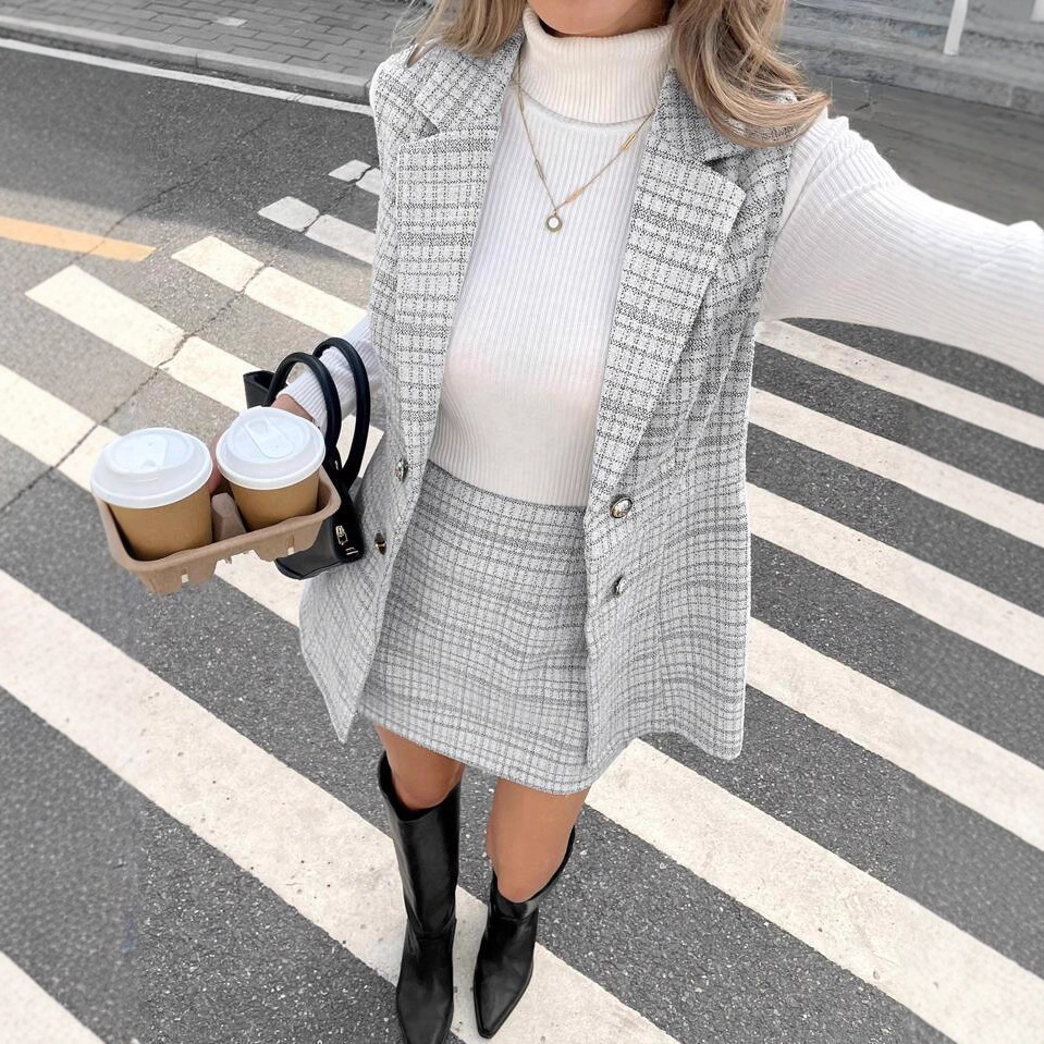 欧美跨境2025亚马逊秋季女新款纹理双排扣西装外套包臀裙休闲套装