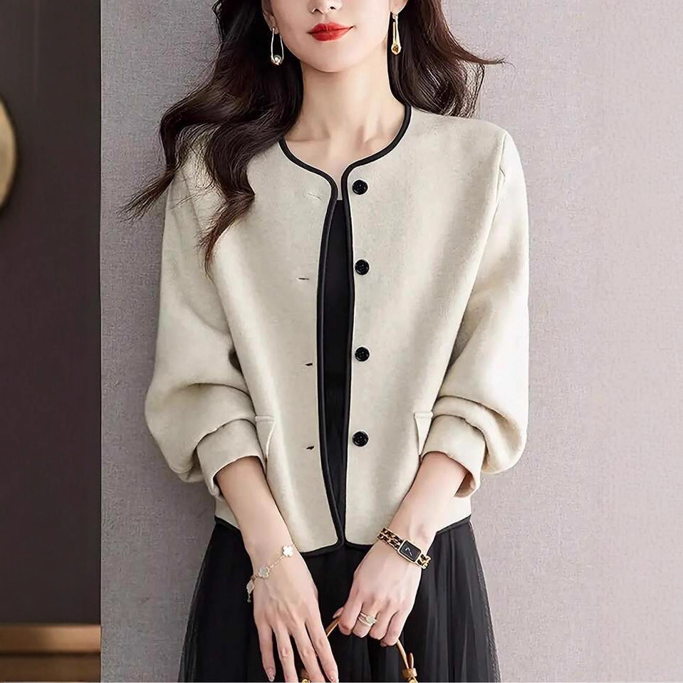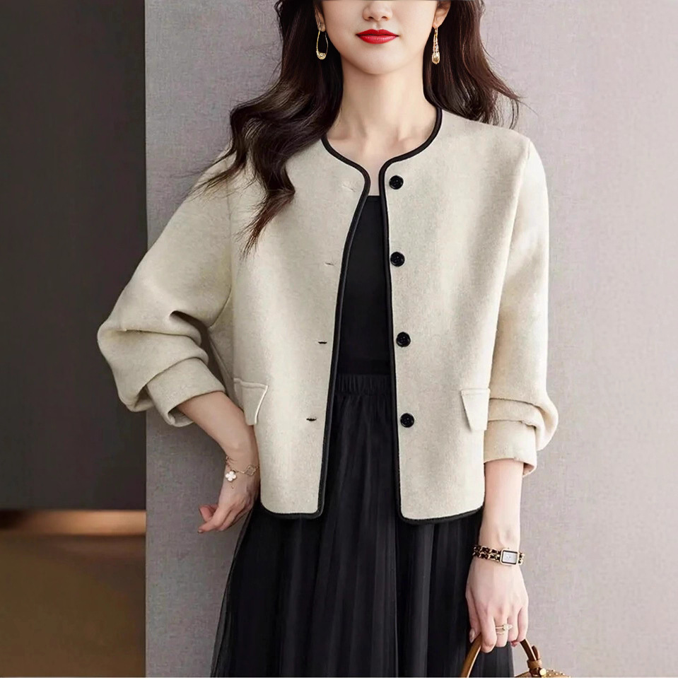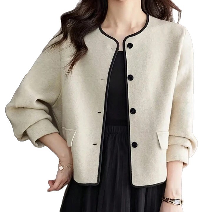 欧美外贸2025独立站小香风毛呢外套女春秋冬季圆领短款开衫外套