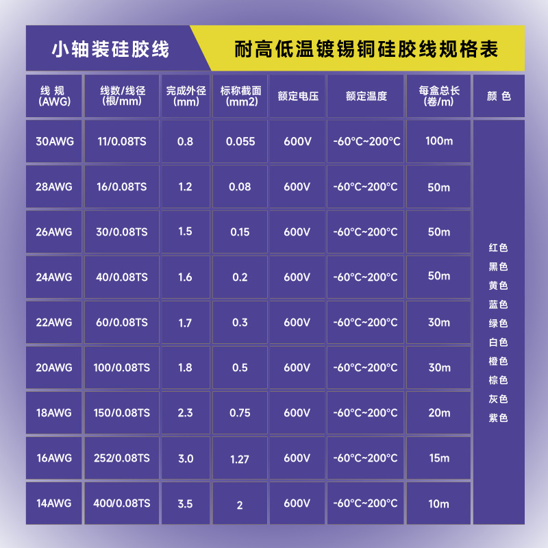 | 规格型号 | 小轴装硅胶电线-14AWG-10米-紫色 | 规格型号 | 小轴装硅胶线 |