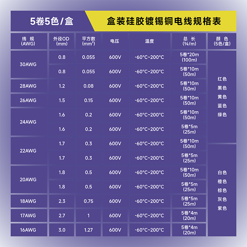 规格型号 | 5卷/盒装硅胶线-22AWG-5卷*10米-红黑黄蓝绿 | | 规格型号 | 5卷/盒装硅胶线-22AWG-5卷*10米-白橙棕灰紫 |