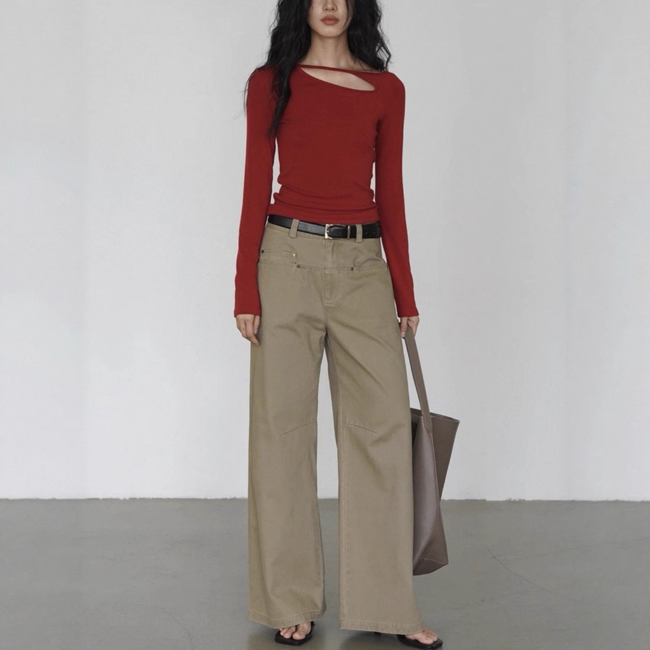 EIGHTHMONTH 红色单侧挖空长袖上衣女设计感小众春季显瘦打底T恤