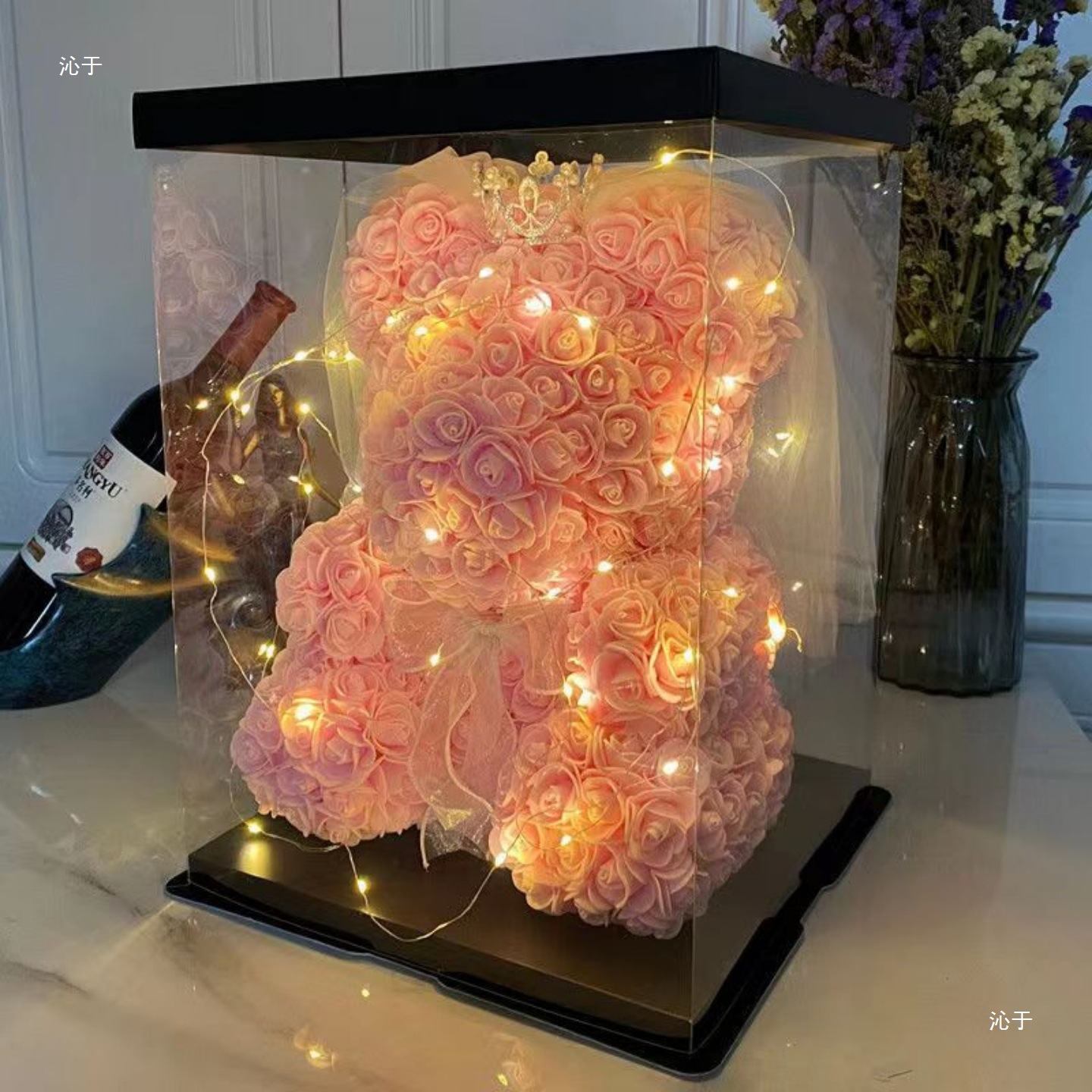 颜色 | 红色 25cm玫瑰熊+OPP袋 | | 颜色 | 白色 25cm玫瑰熊+INS风礼盒+灯带 |