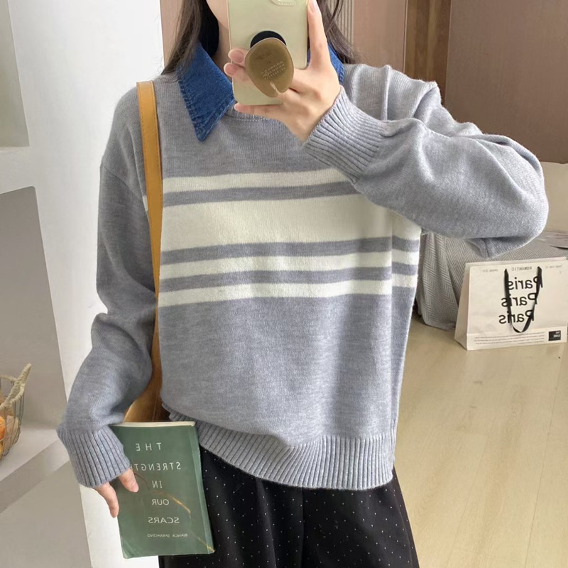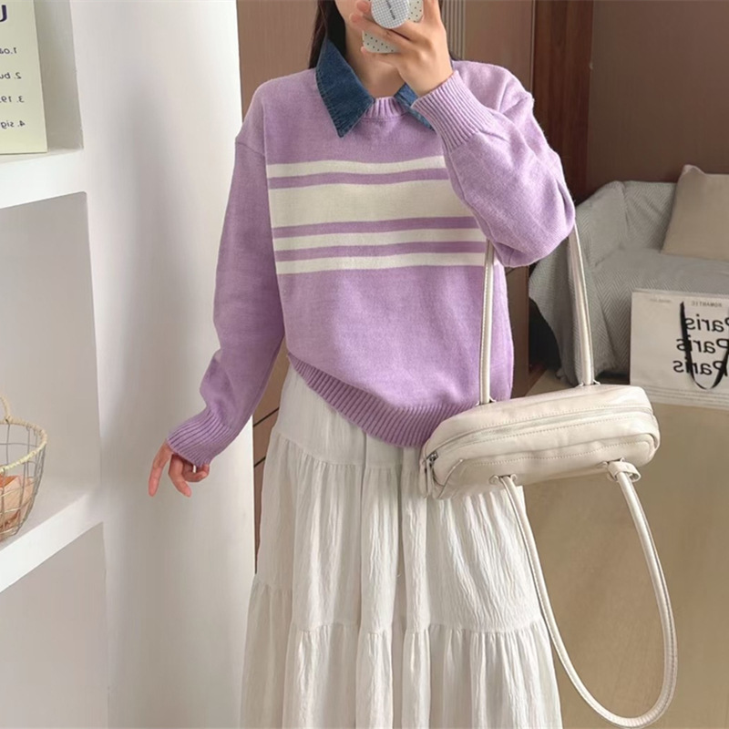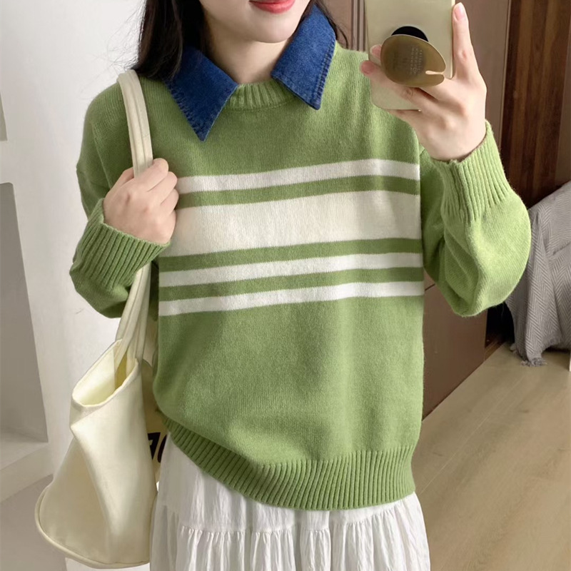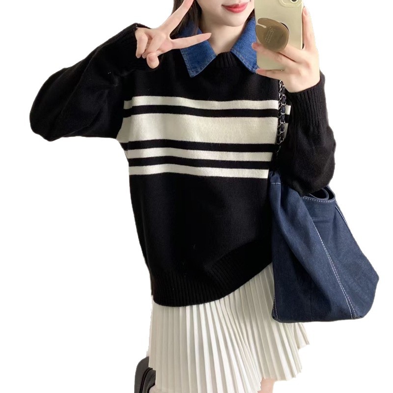 假两件撞色条纹针织2025新款时尚百搭牛仔拼接针织衫上衣毛衣