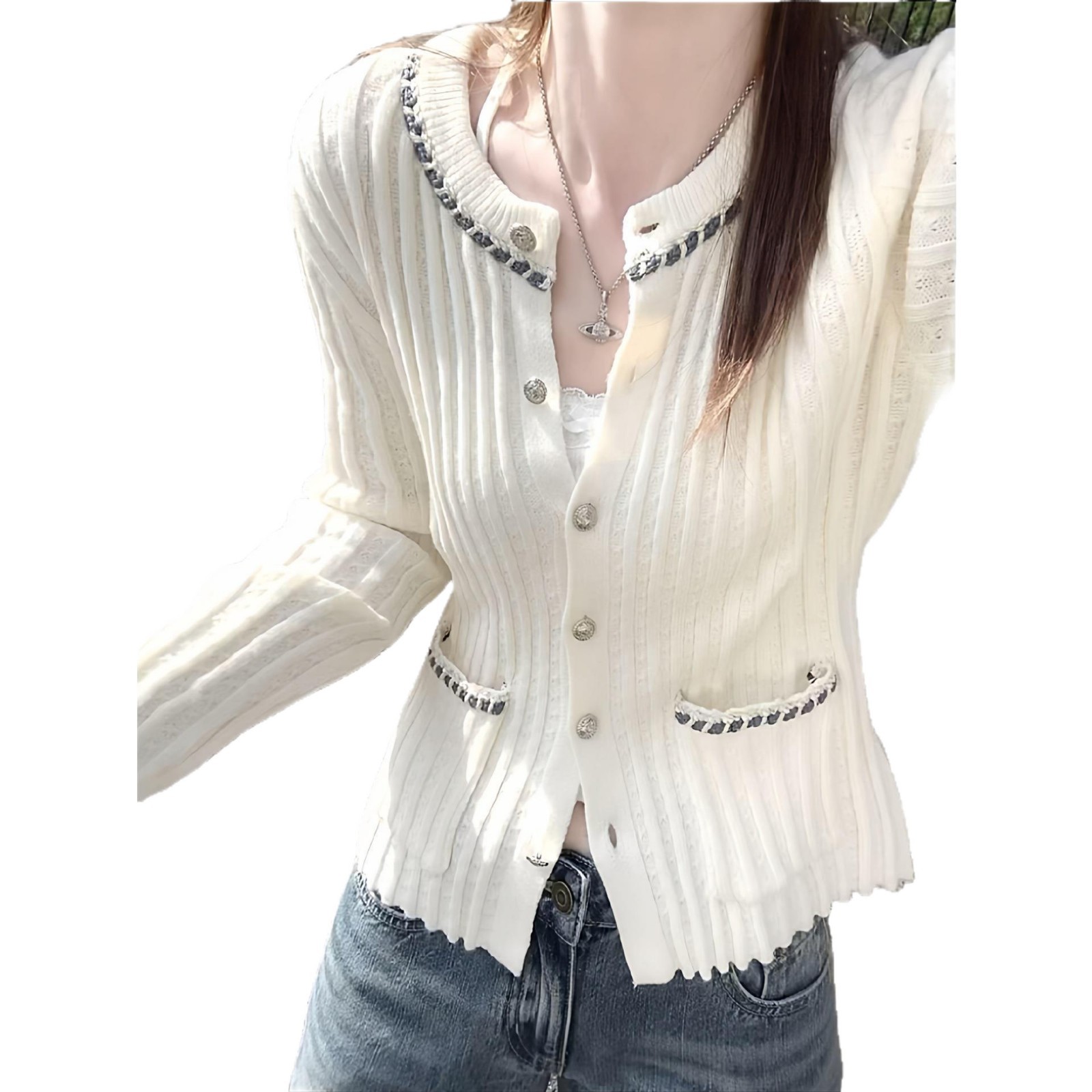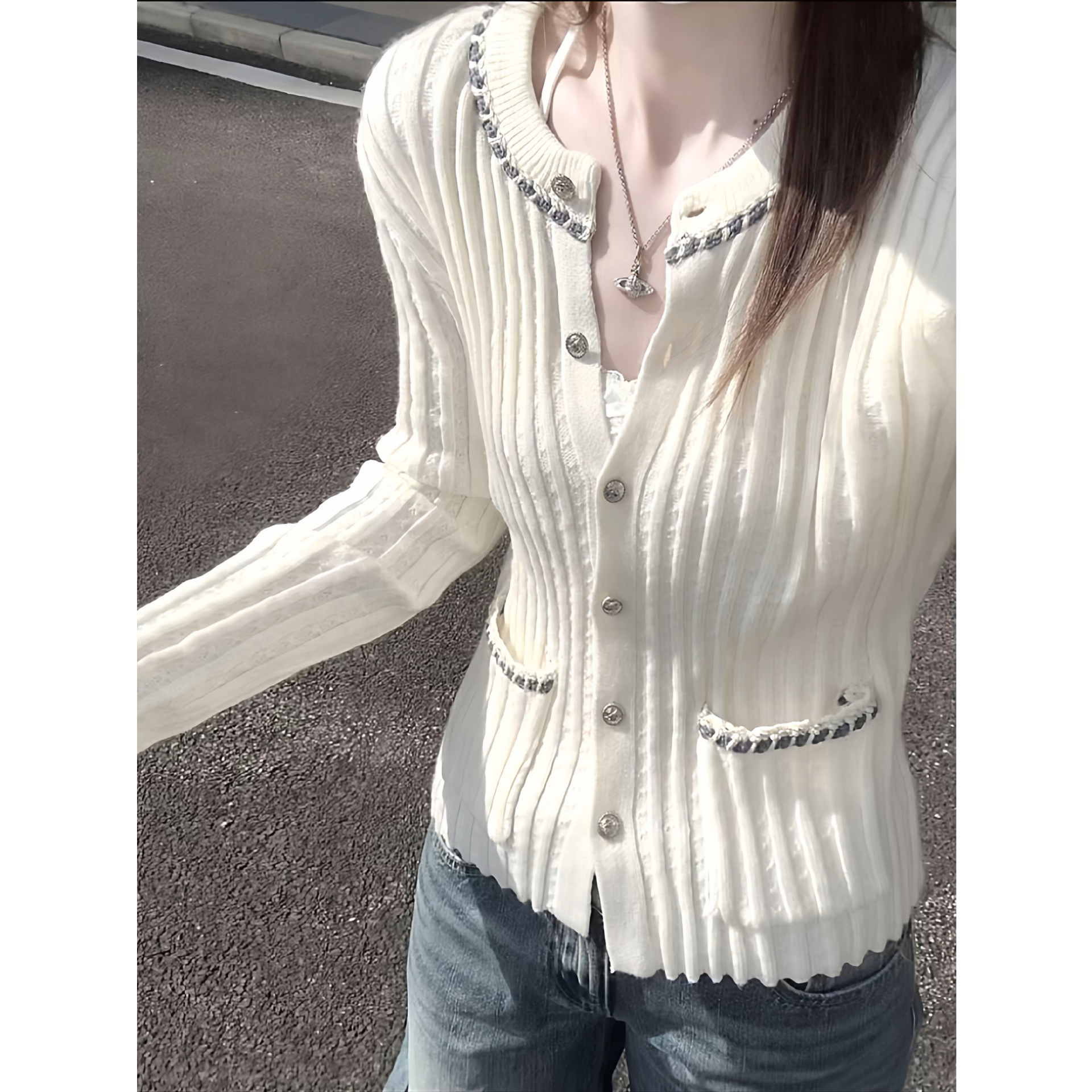2025新款时尚百搭百搭小香风长袖白色针织开衫女设计感外套上衣