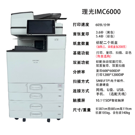 | 颜色规格 | 理光IM5000(标配双纸盒) 【50页/分钟】 | 颜色规格 | 理光 IMC6000彩机 支持无线打印 |