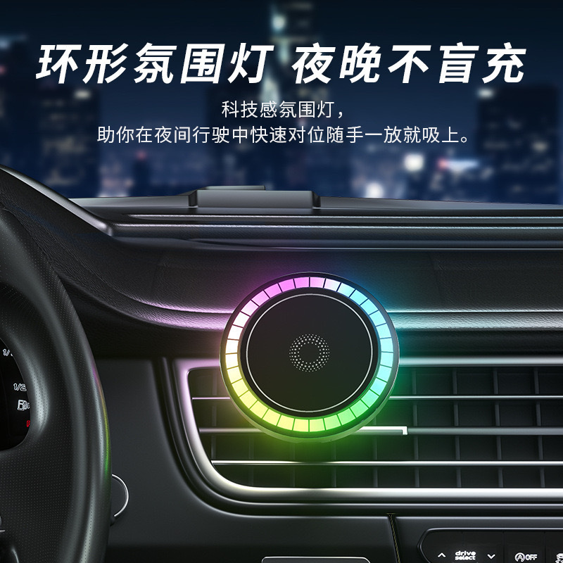 新款车载导航无线充手机支架磁吸式炫彩氛围灯跨境汽车装饰出风口