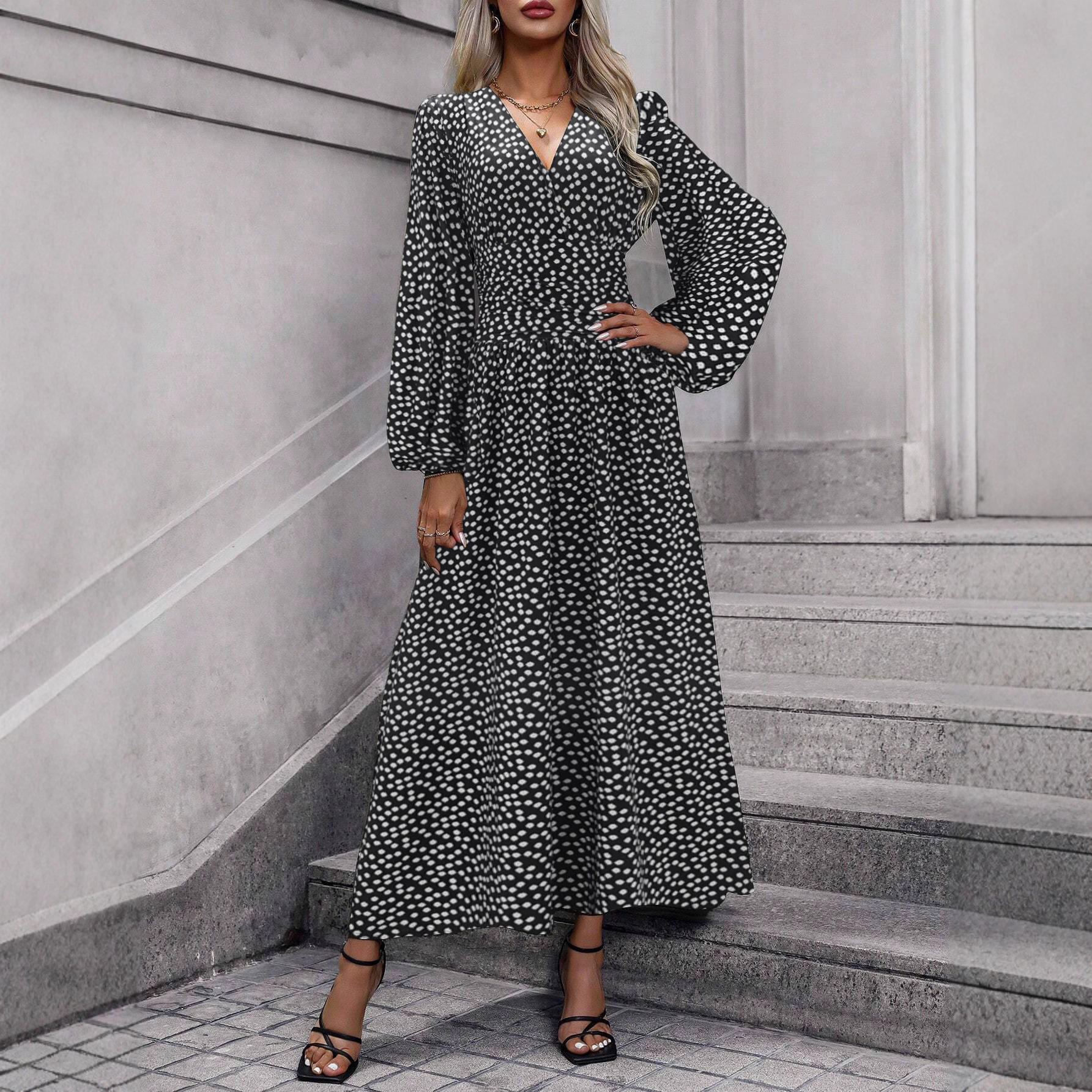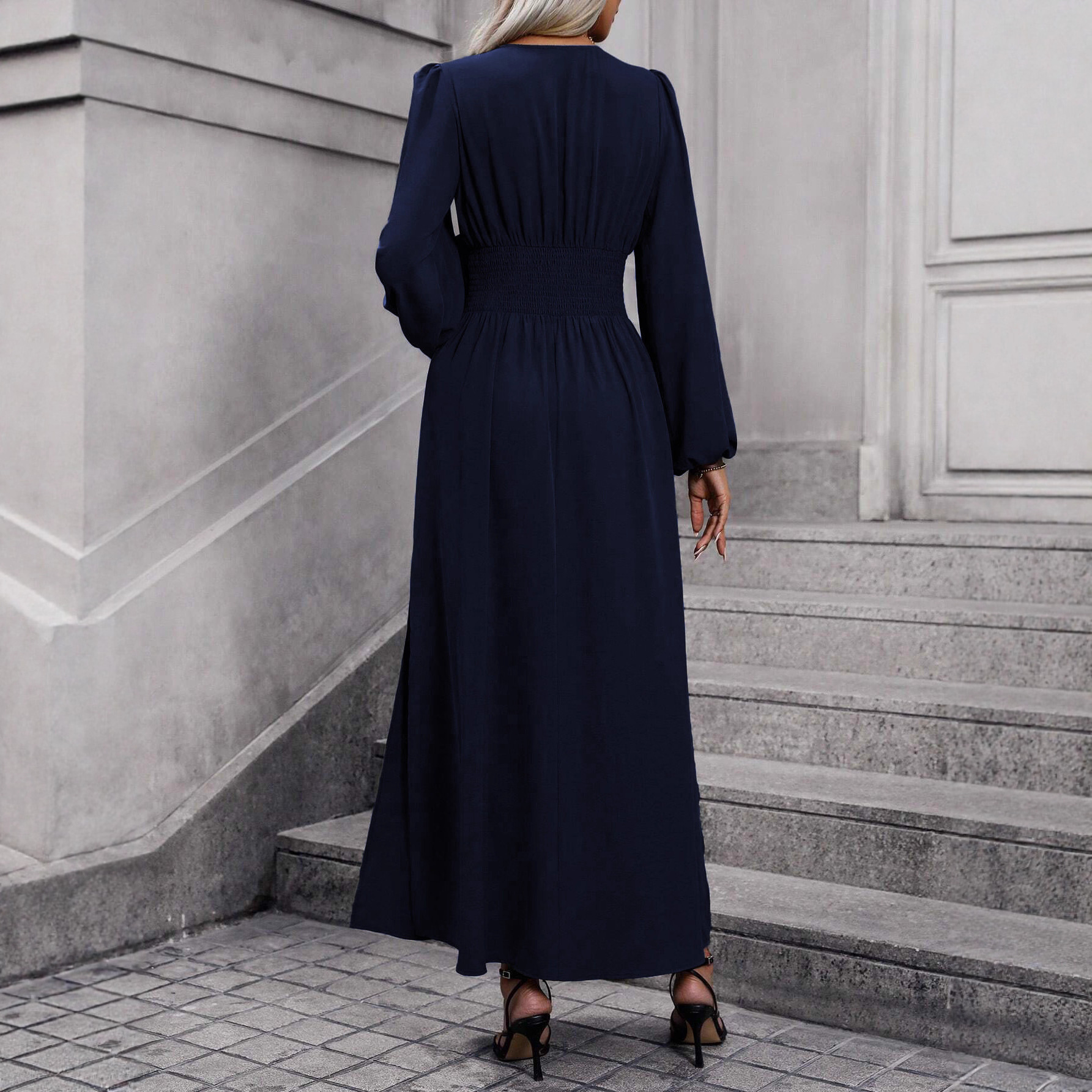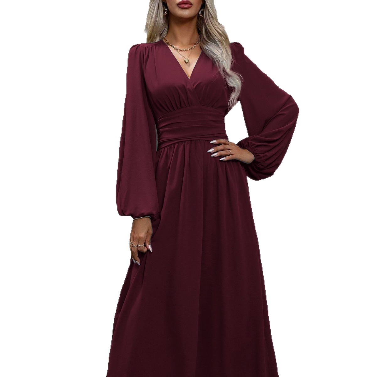 欧美跨境秋冬新款女士灯笼袖打揽高开叉纯色V领连衣裙