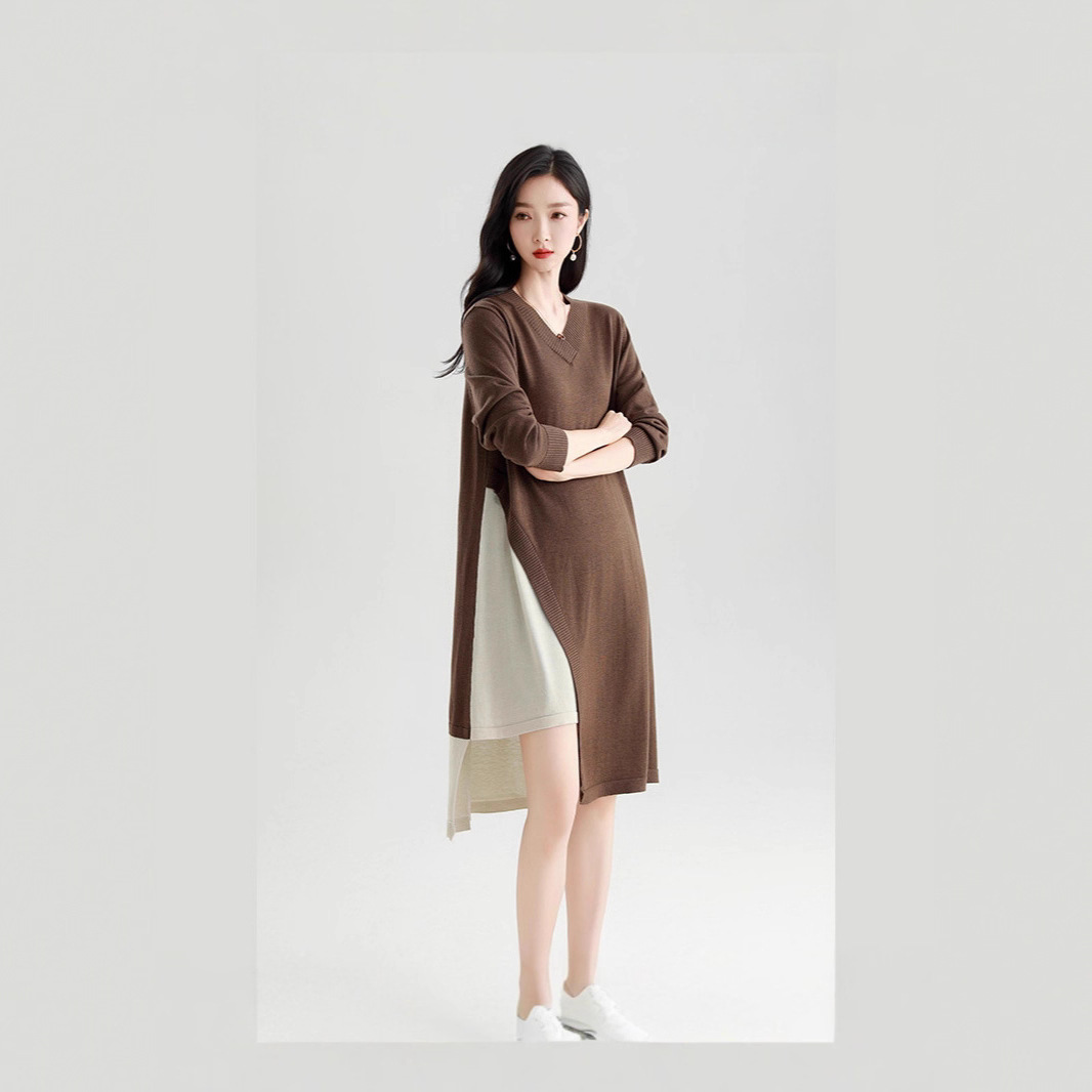 2025秋冬新款V字领套头长袖撞色宽松休闲韩版针织打底中长连衣裙