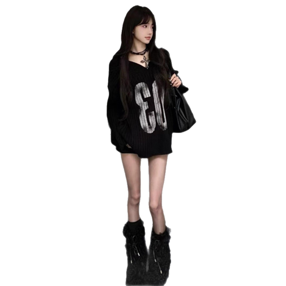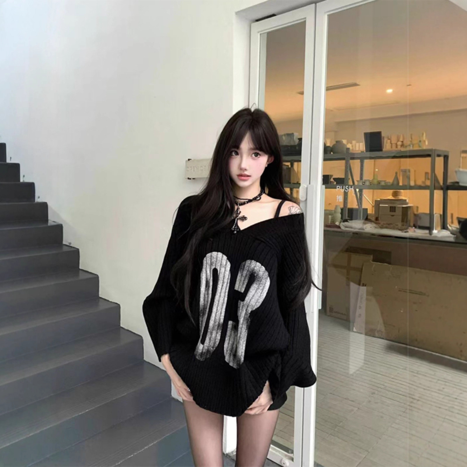 2025新款宽松慵懒风针织外套复古辣妹黑色露肩领毛衣女秋冬
