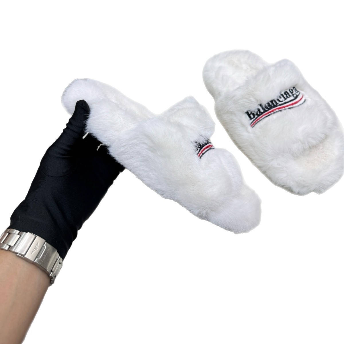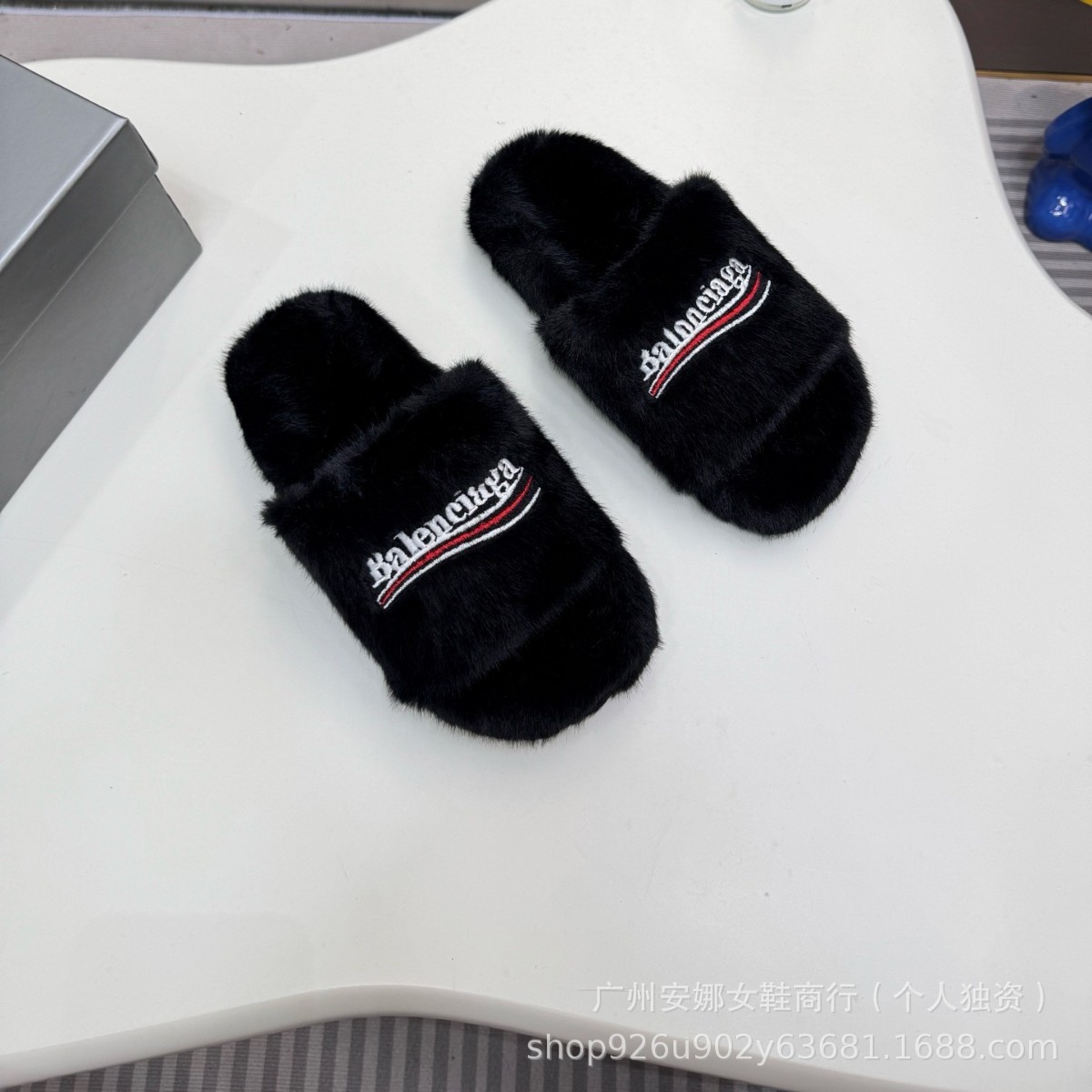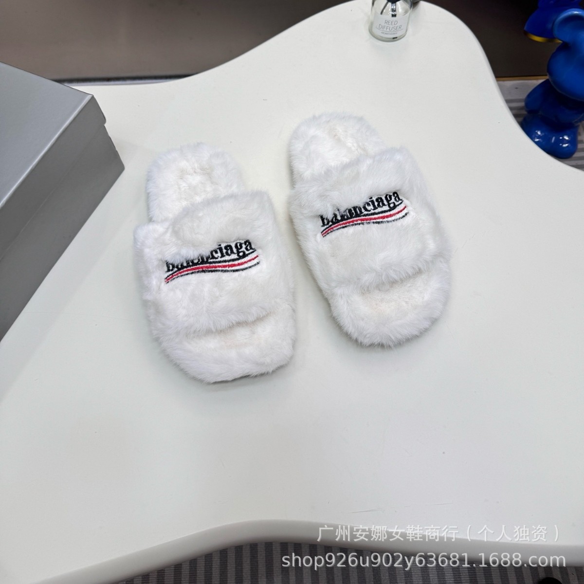 B家2025冬季新款刺绣一字加厚居家时尚外穿情侣羊羔毛厚底毛拖鞋