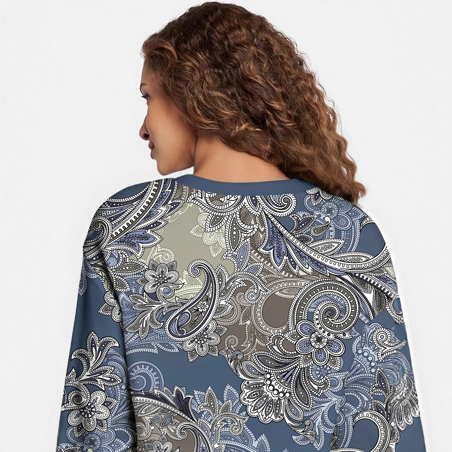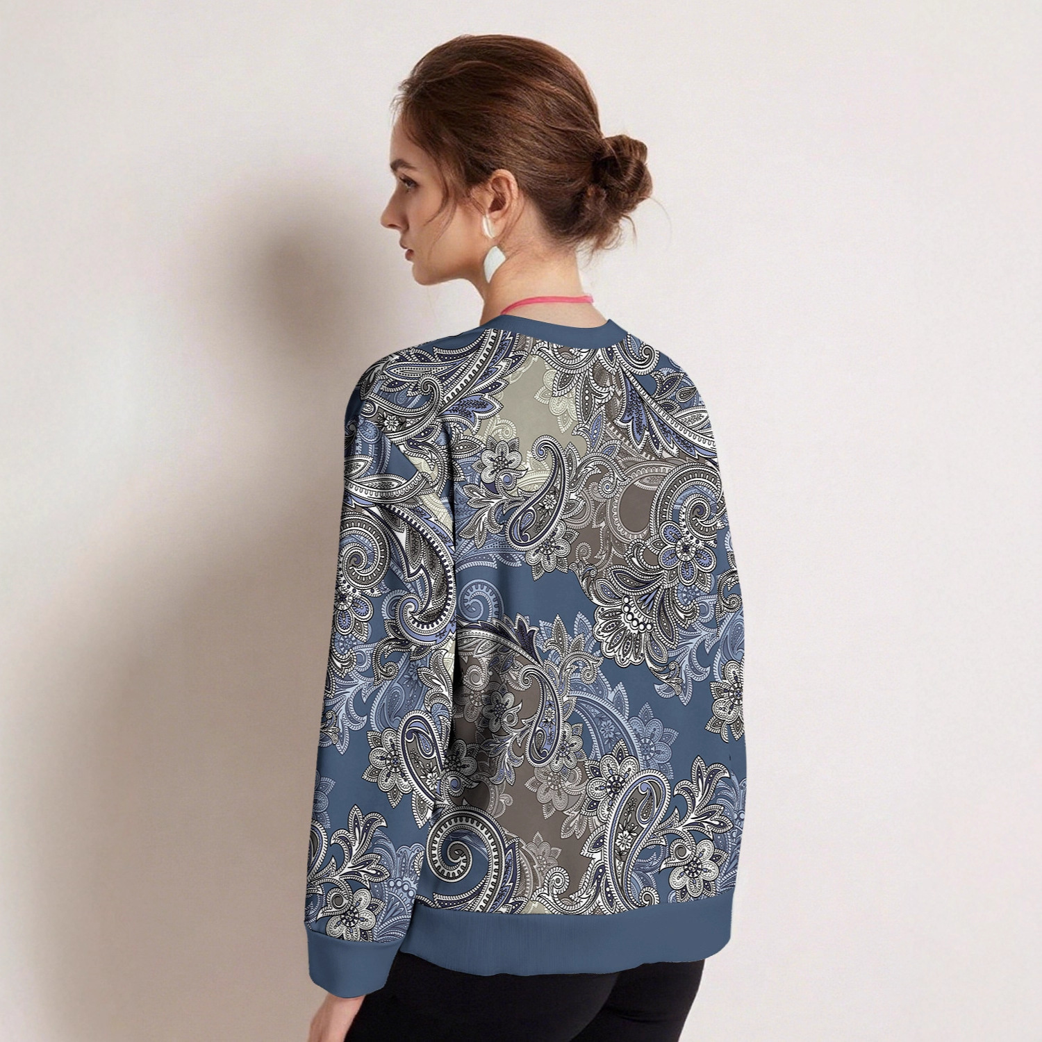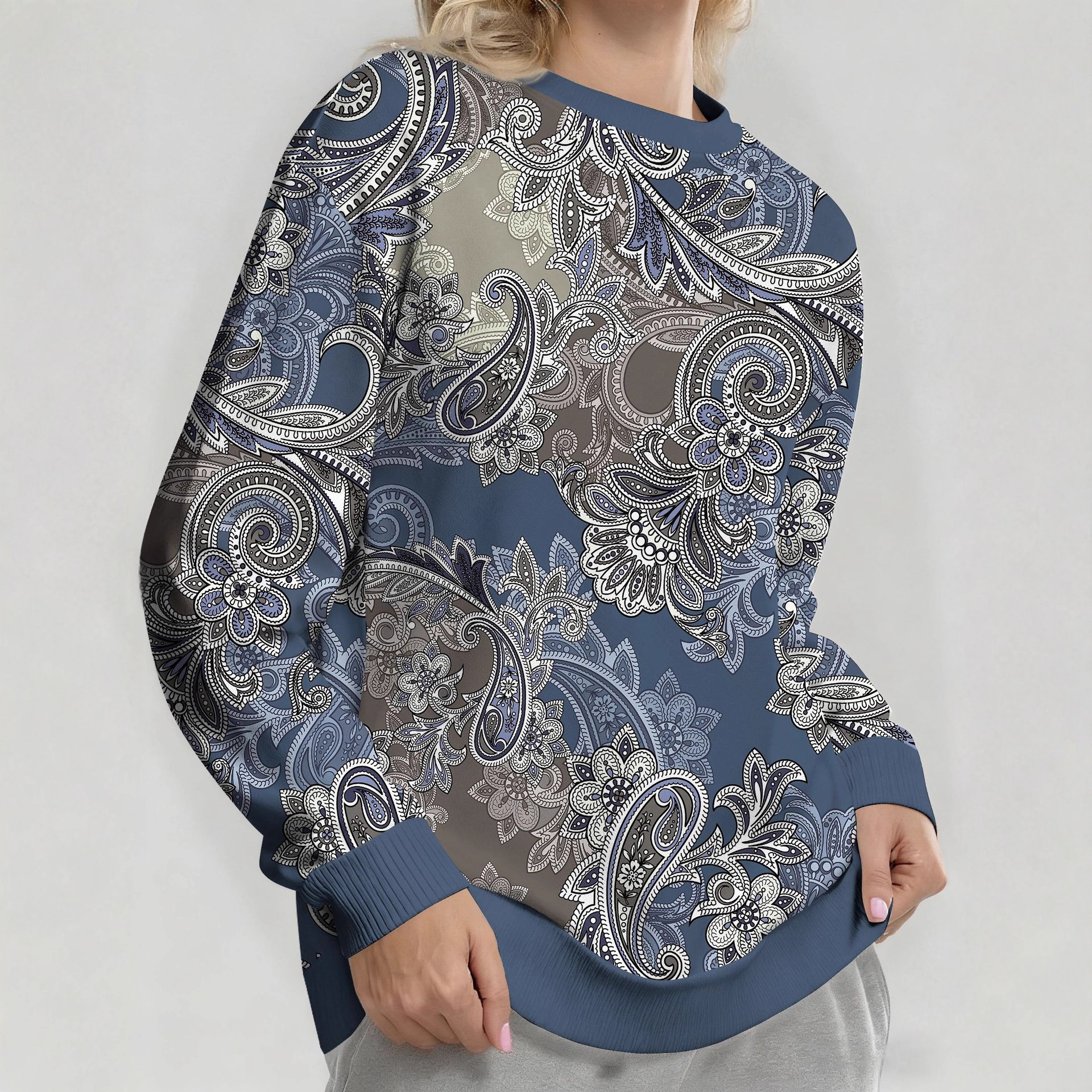 跨境欧美新款秋冬女装圆领复古提花印花图案休闲宽松卫衣女秋外套