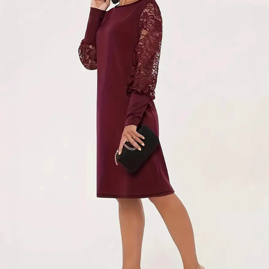 欧美女装跨境亚马逊连衣裙圆领长袖镂空蕾丝袖拼接修身连衣裙