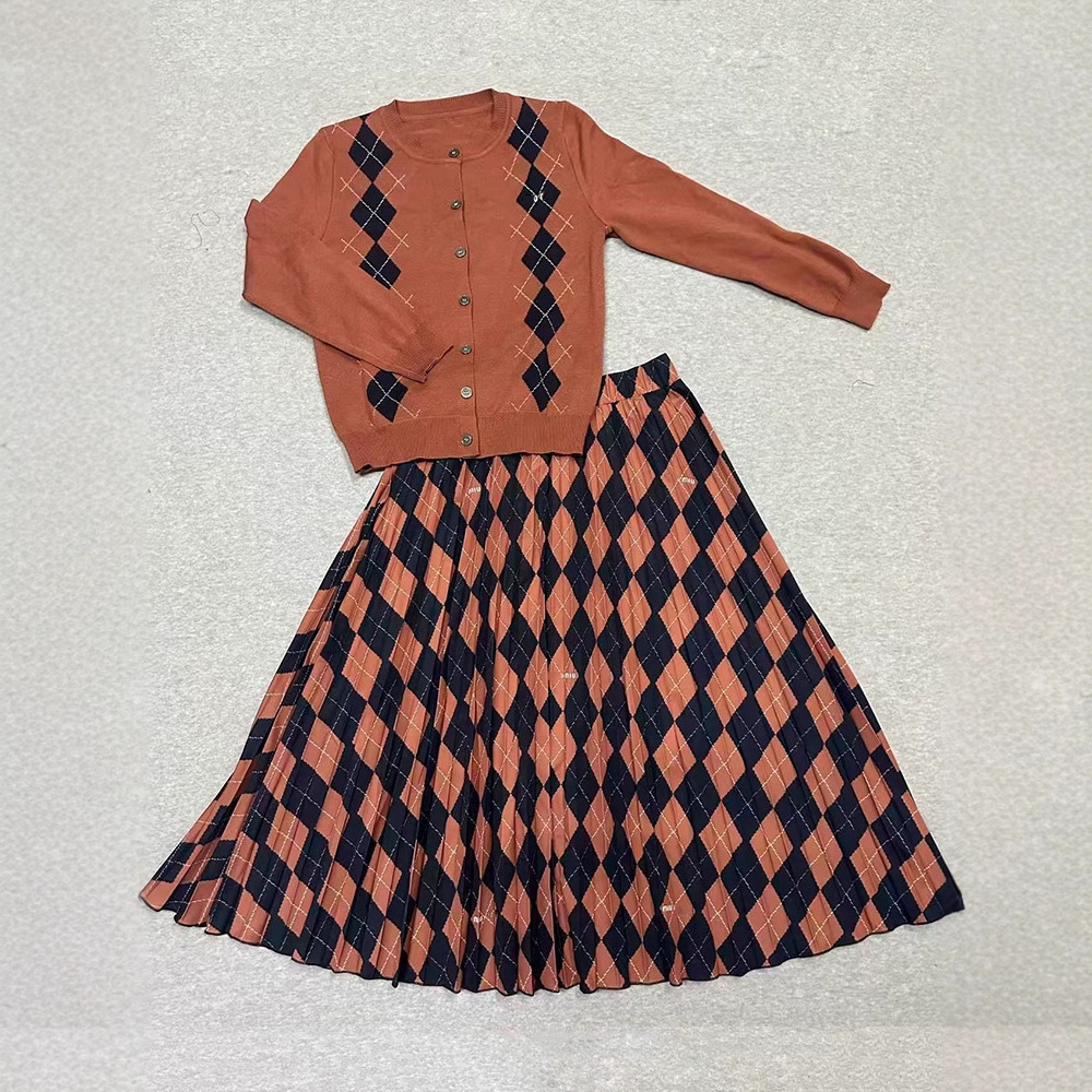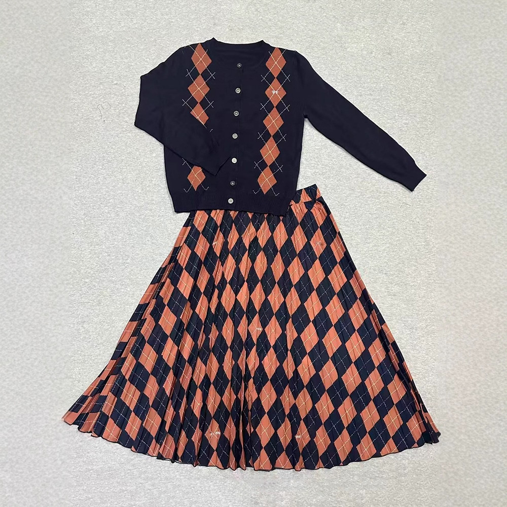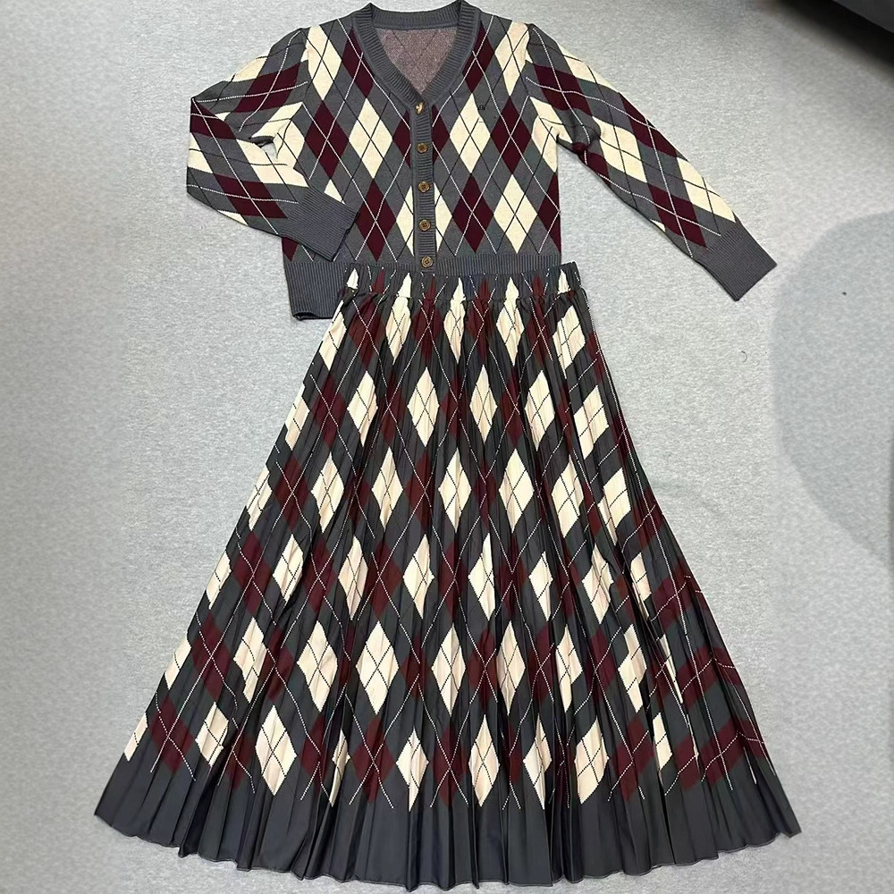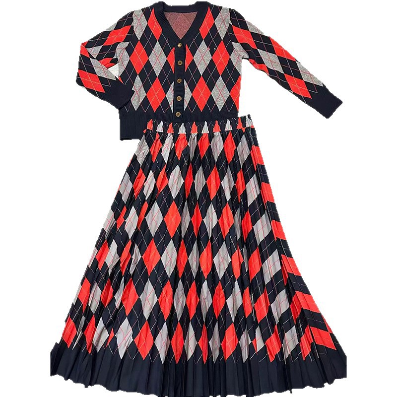 外贸女装复古几何针织毛线开衫两件套秋+跨境宽松百褶半身裙套装