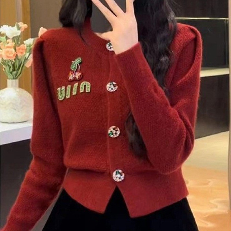 2024年秋冬新款修身小香风上衣高级感樱桃字母刺绣开衫毛衣女