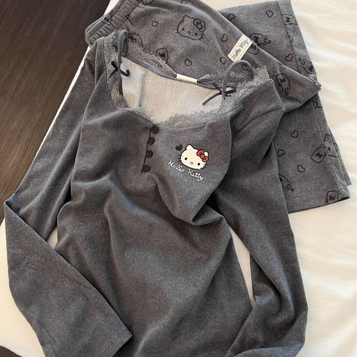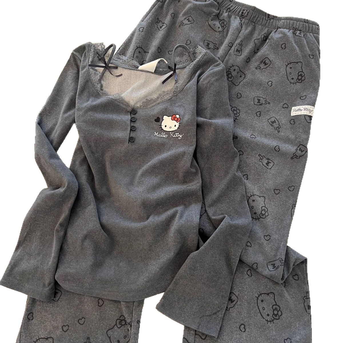 韩系少女蕾丝拼接KT猫德绒睡衣女春秋新款舒适长袖长裤家居服套装