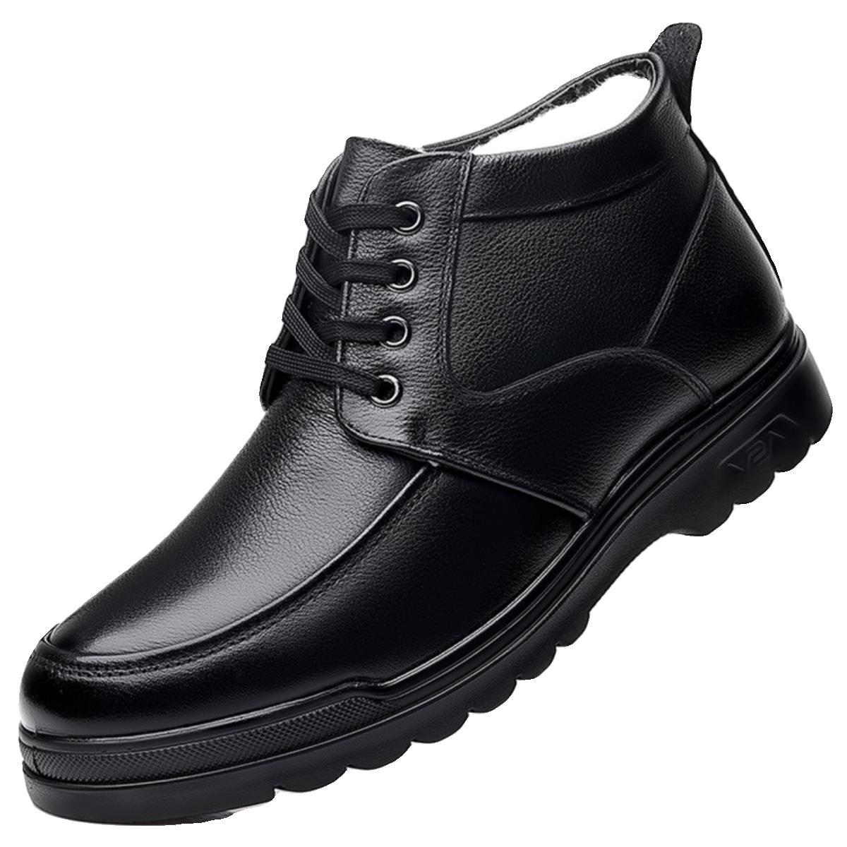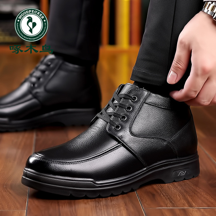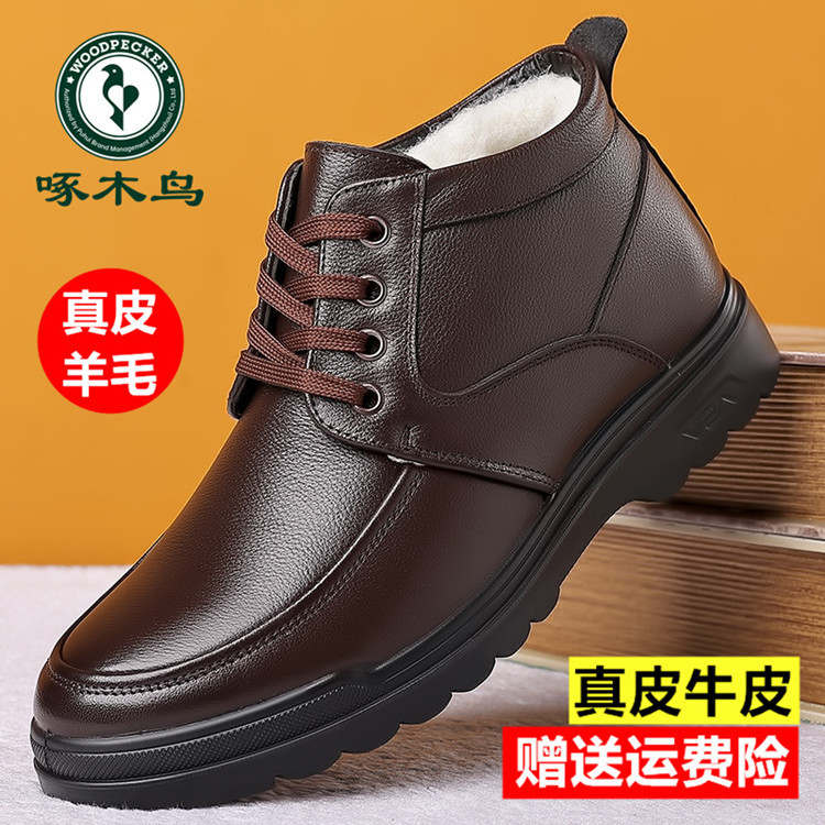 啄木鸟头层牛皮中帮棉鞋男中老年冬季加绒皮鞋防滑软底羊毛爸爸鞋