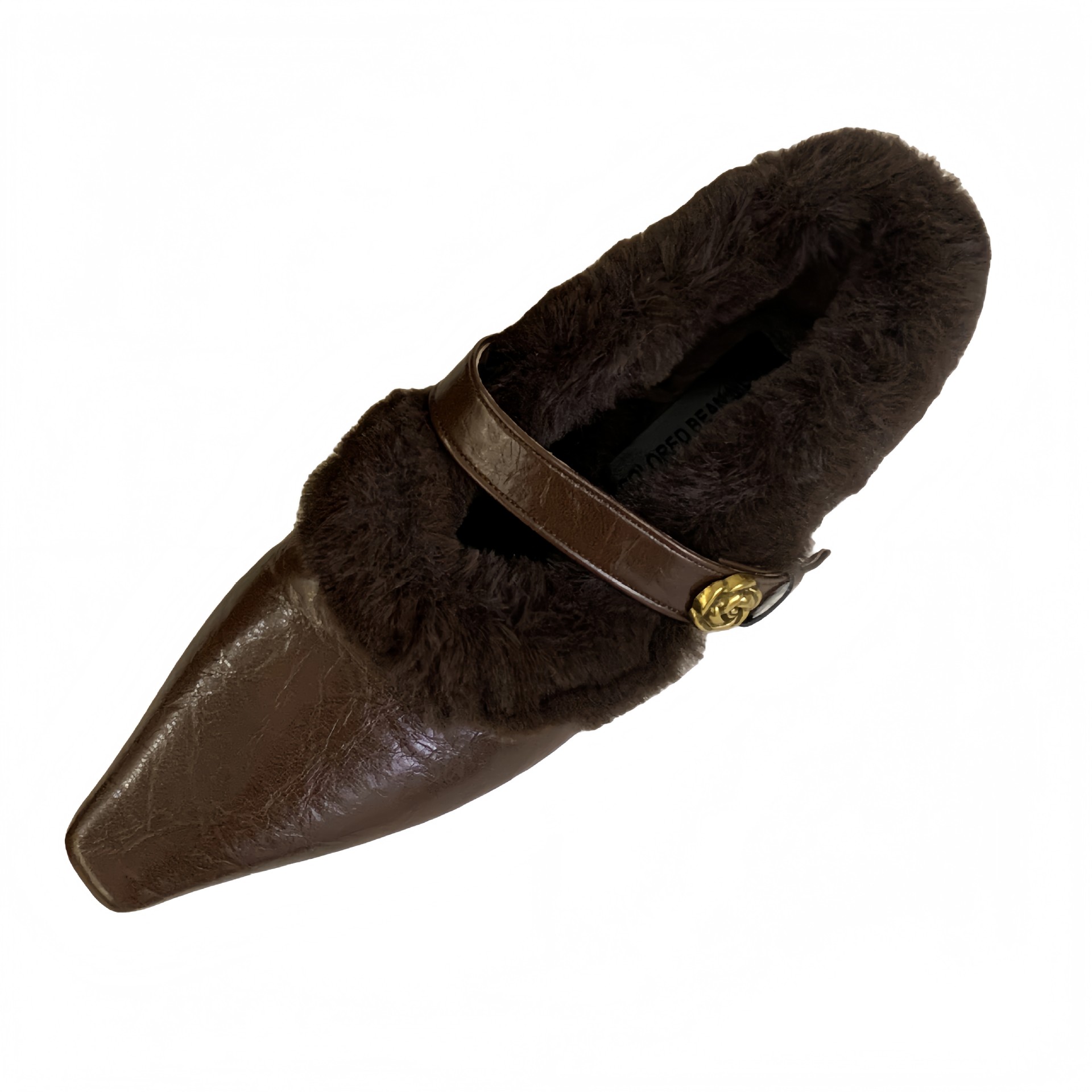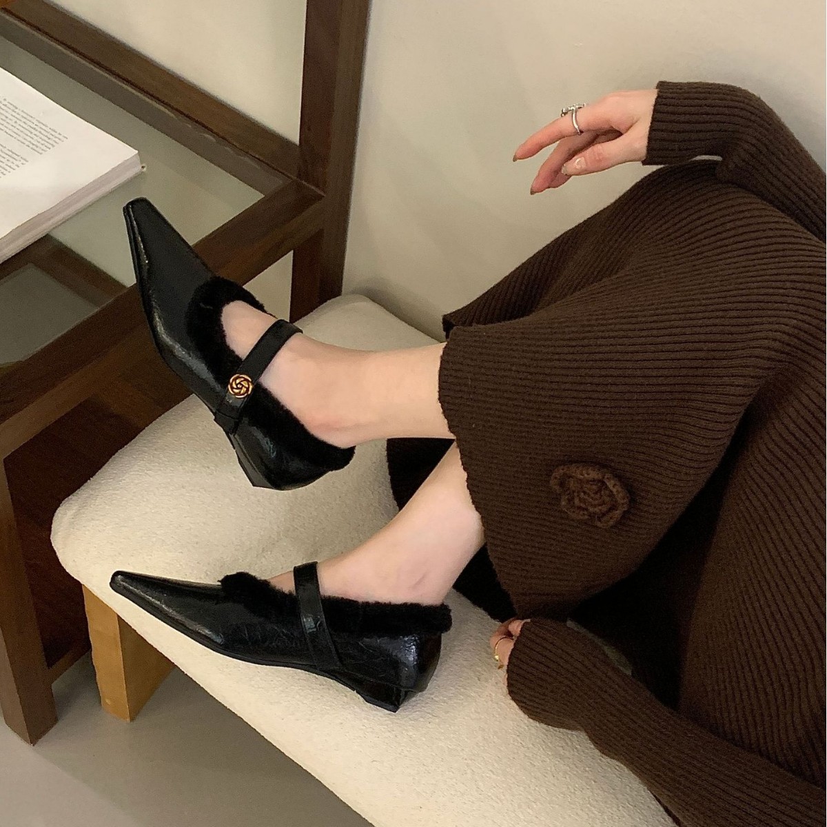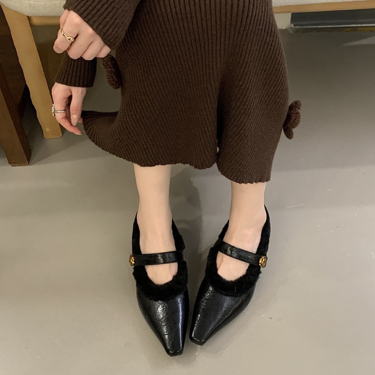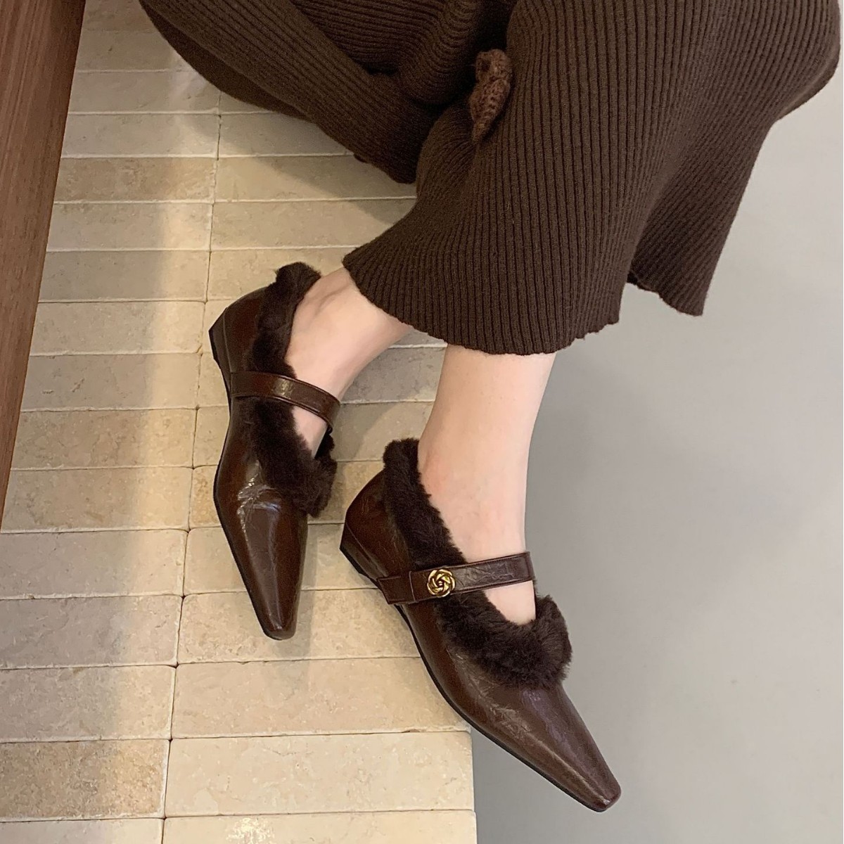 法式小方头坡跟珍毛毛鞋一字带鞋子2025年新款秋冬季玛丽珍鞋加绒