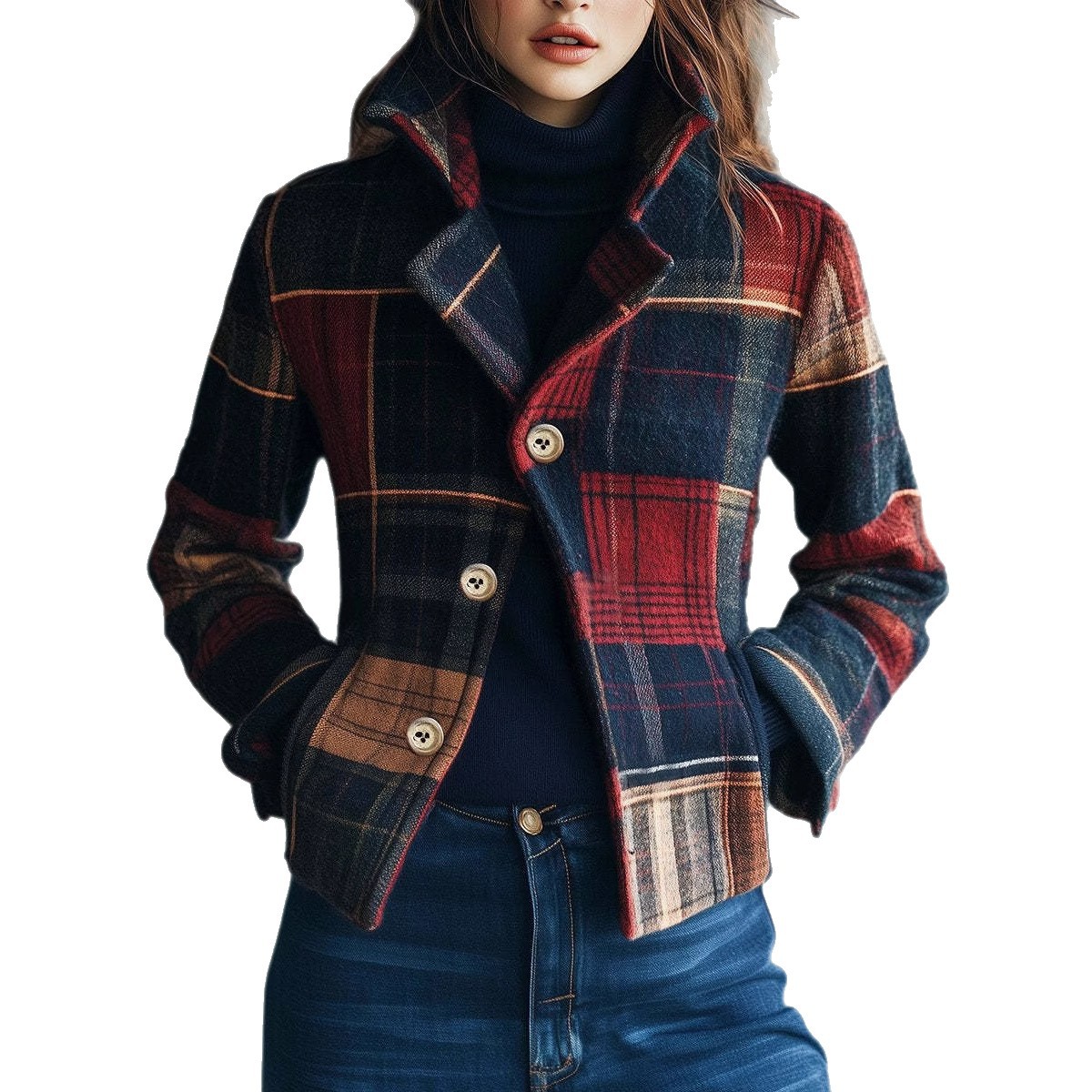 亚马逊跨境欧美女装独立站格纹复古保暖外套秋冬立领拼接纽扣