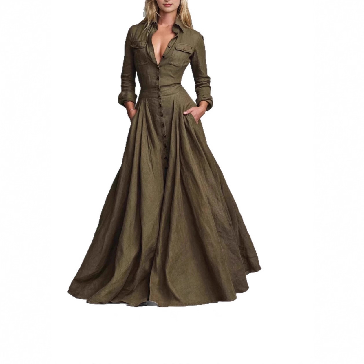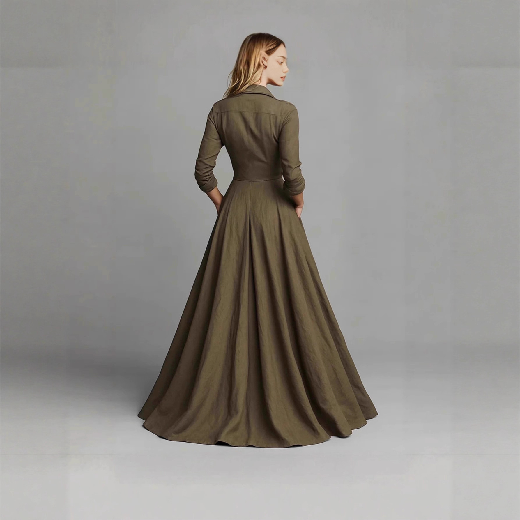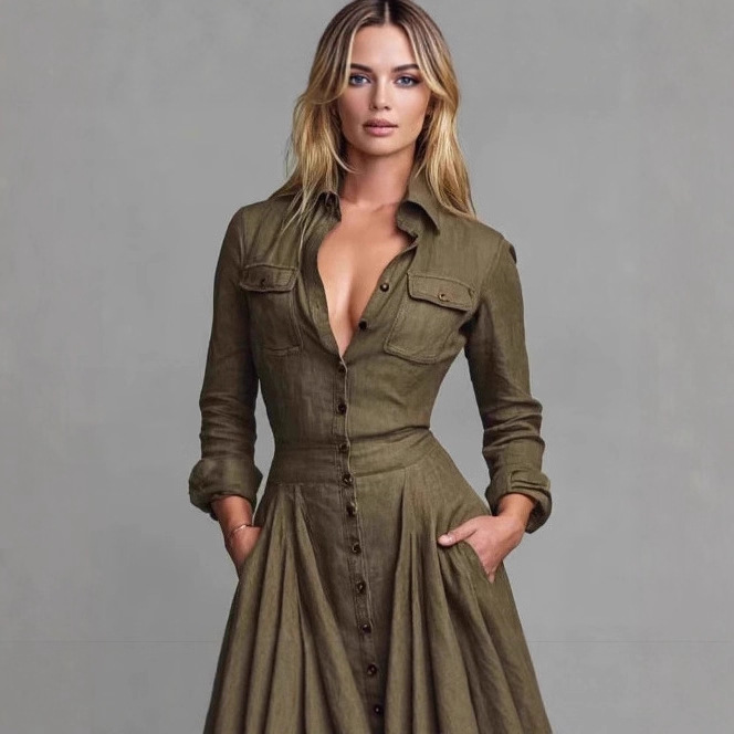 亚马逊跨境时尚女装长袖翻领连衣裙欧美气质优雅高腰显瘦大摆裙子
