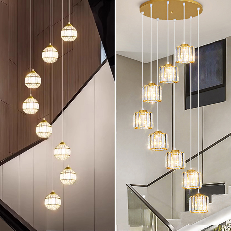 楼梯长吊灯现代简约复式楼梯间水晶美式轻奢别墅高层旋转Loft灯具
