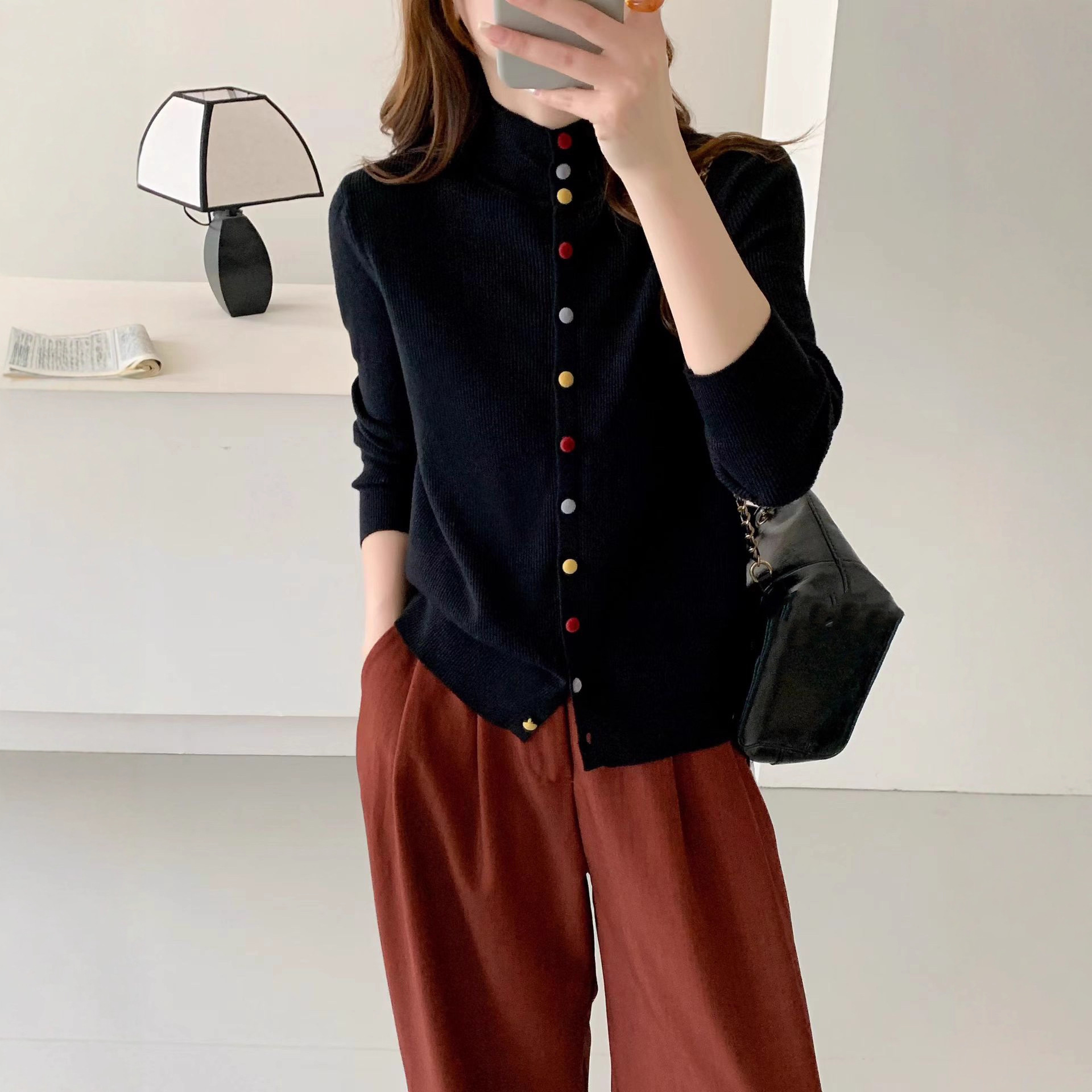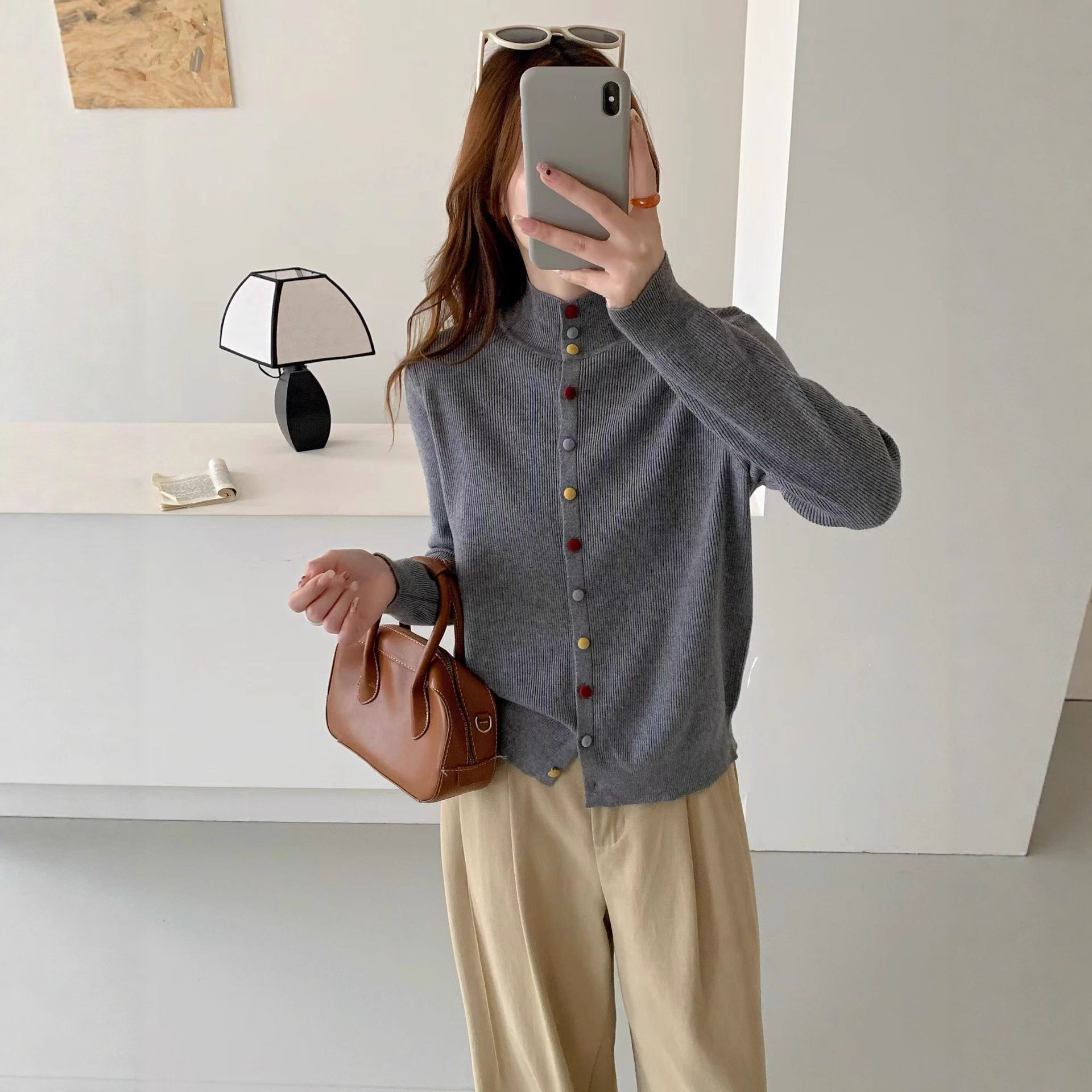 韩系减龄彩扣针织开衫女高翻领毛衣外套秋冬精纺短袖长疯狂购爆卖