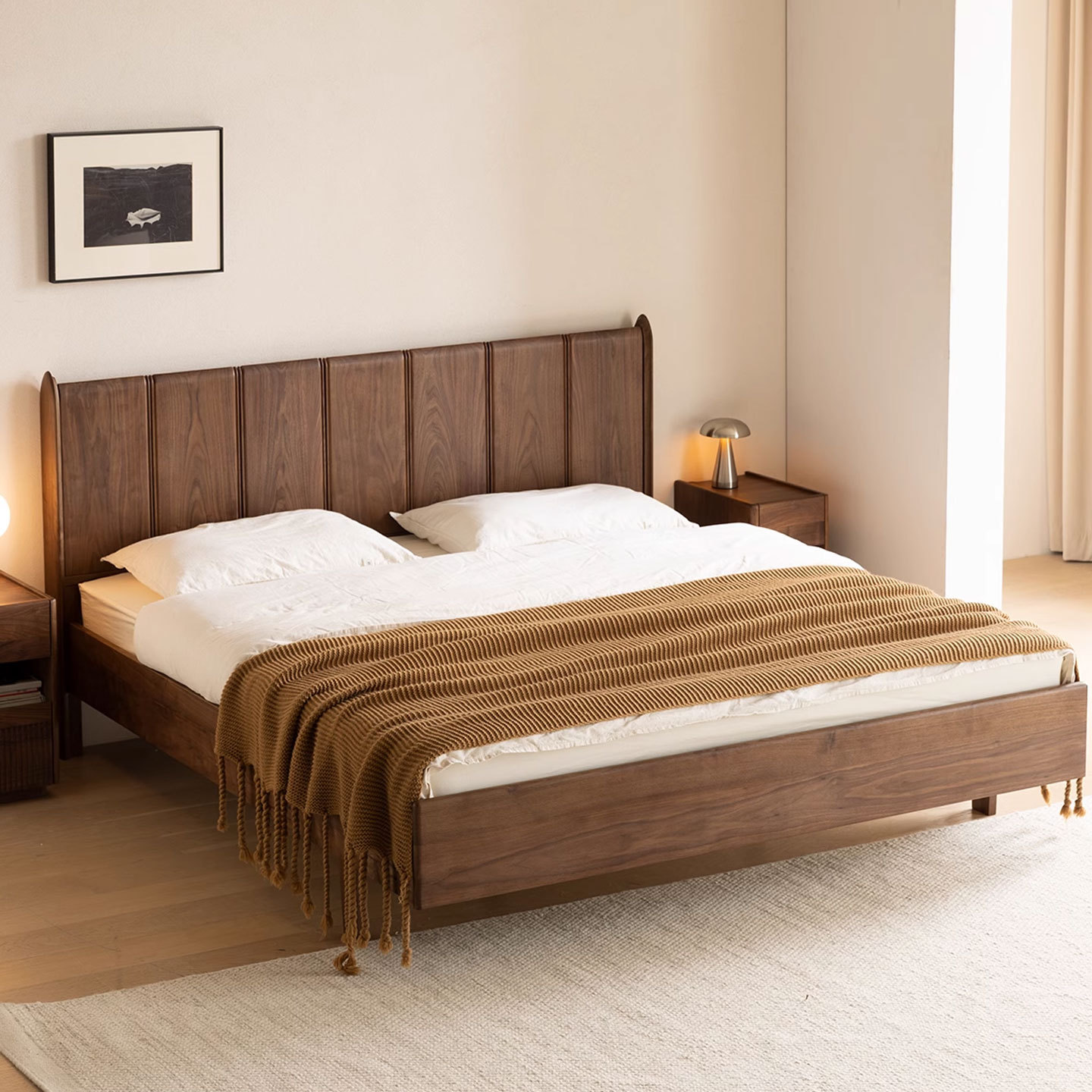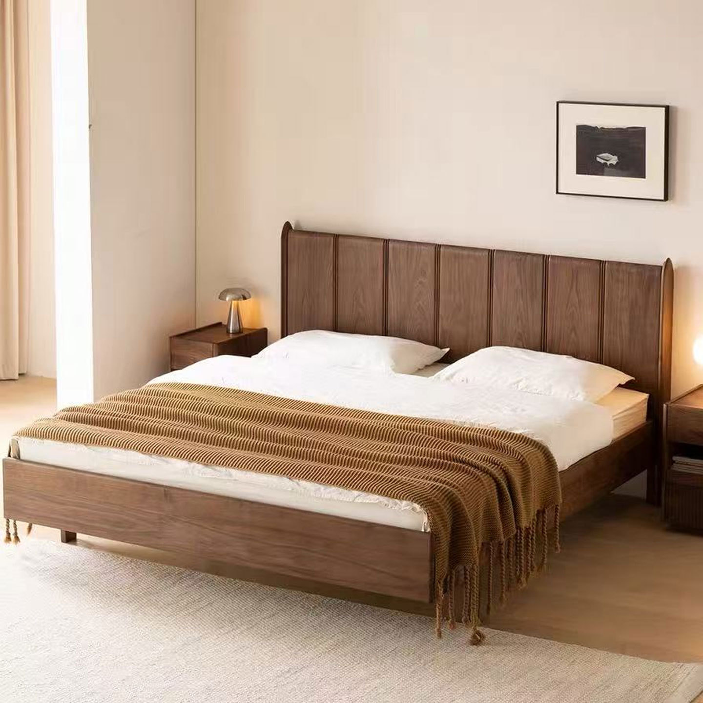 北美黑胡桃木实木双人床北欧樱桃木原木卧室悬浮法式复古双人大床