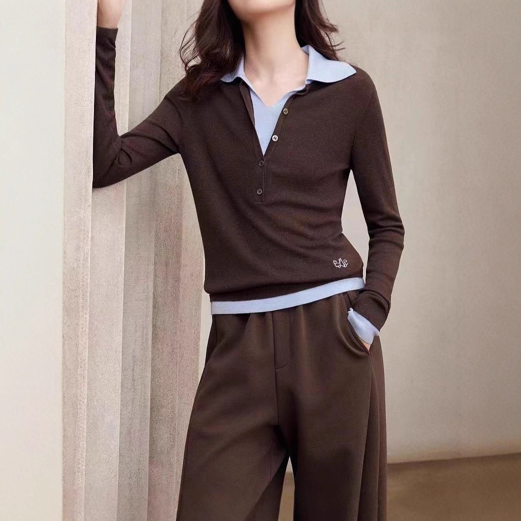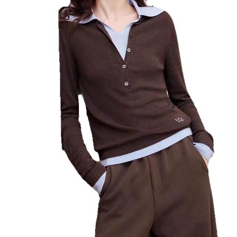 复古修身假两件针织衫女2025冬新款翻领撞色毛衣