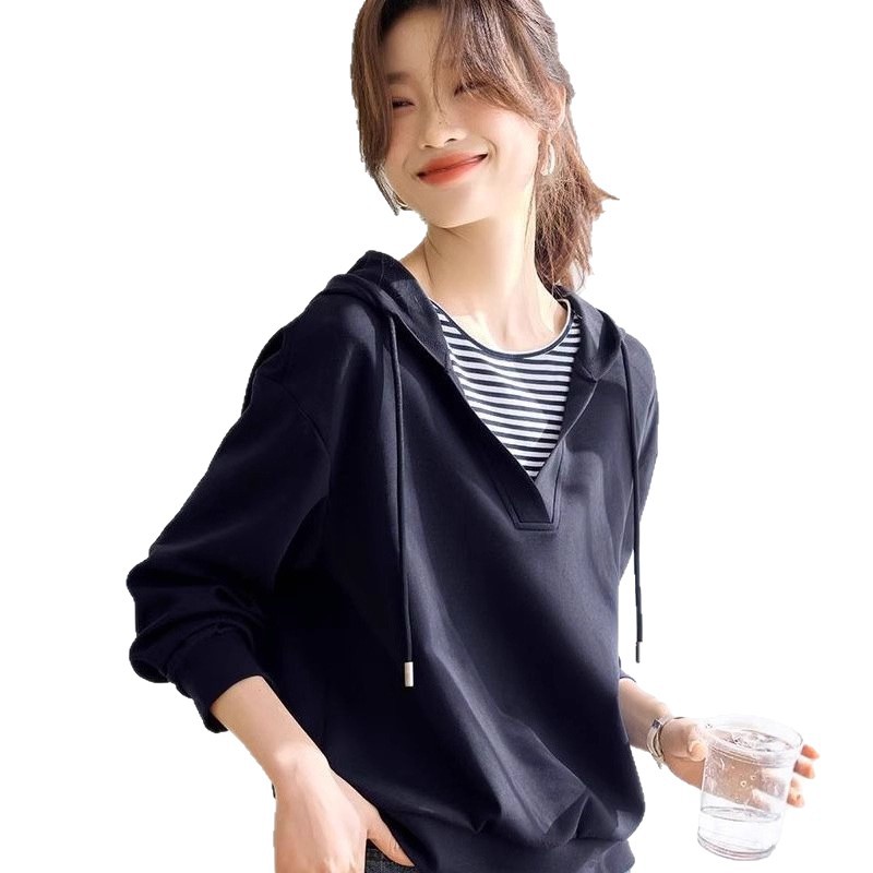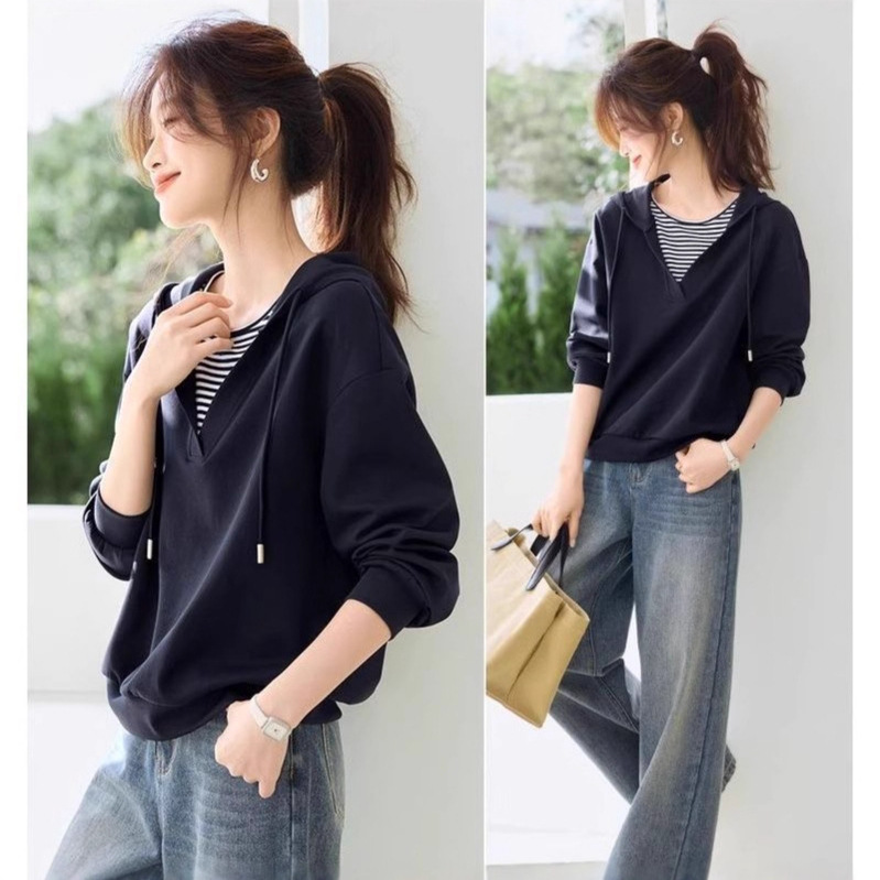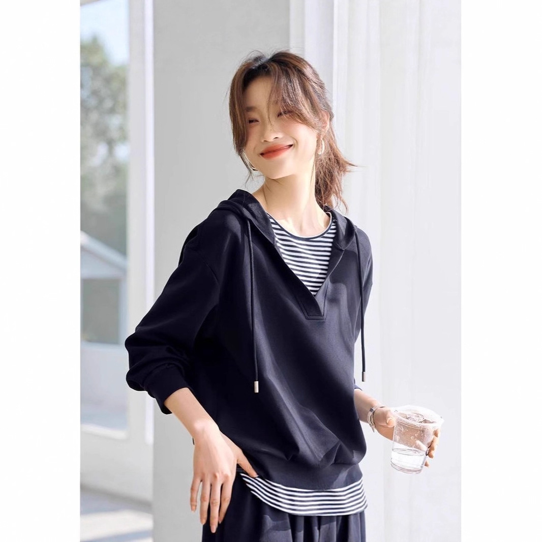 【智性轻通勤拼接撞色条纹休闲上衣】2025秋季款女连帽卫衣