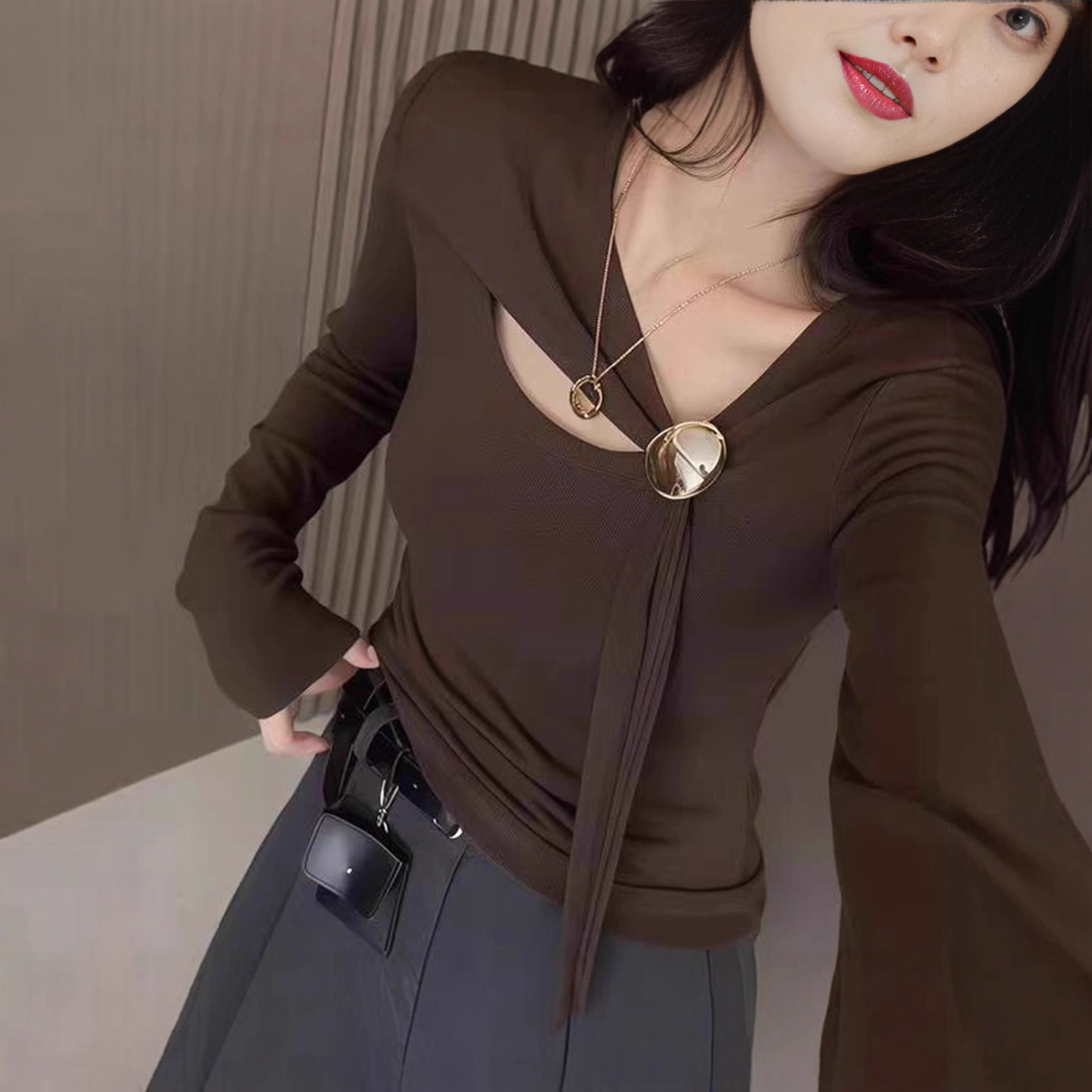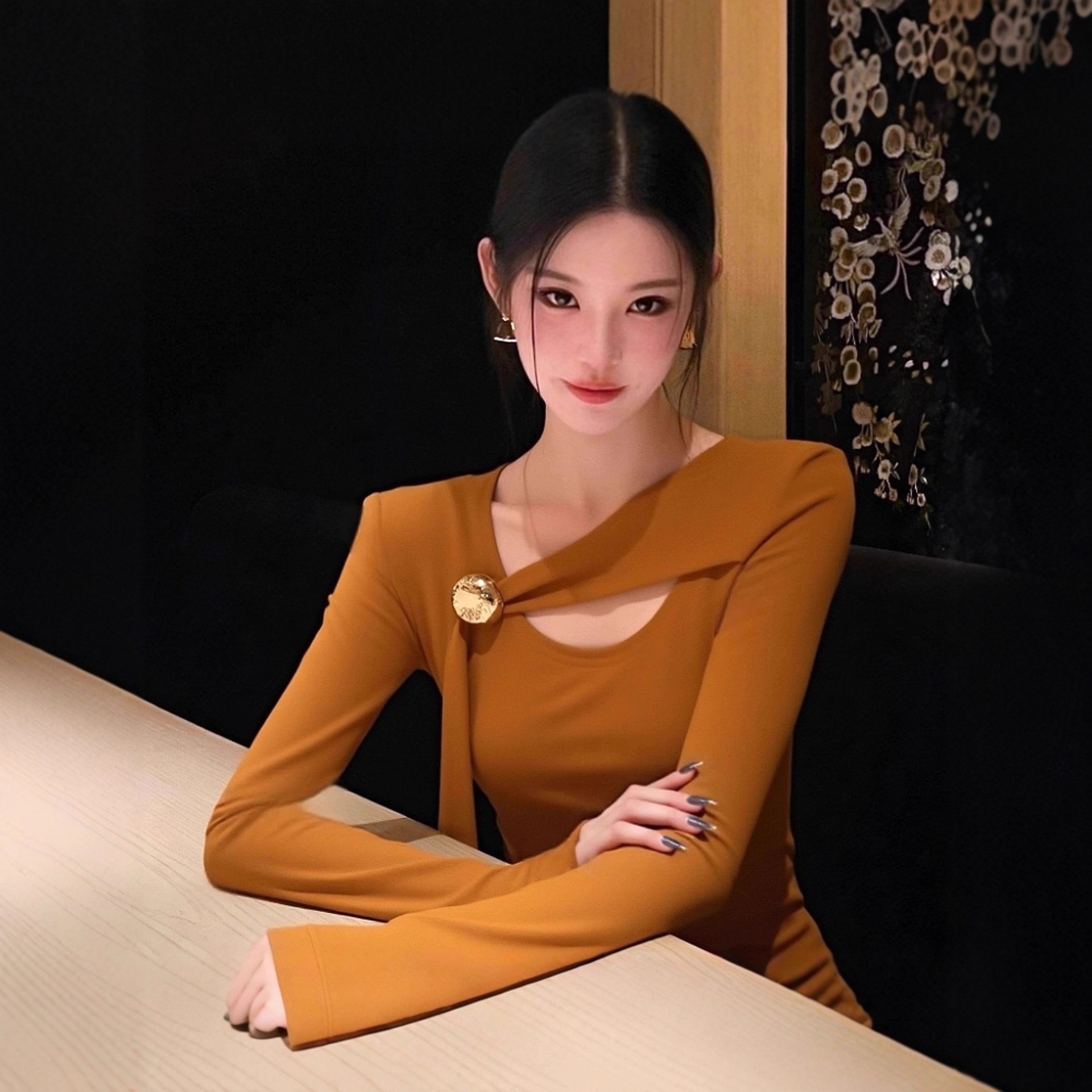 辣妹不规则斜肩镂空飘带长袖T恤秋季设计感修身显瘦打底衫上衣女
